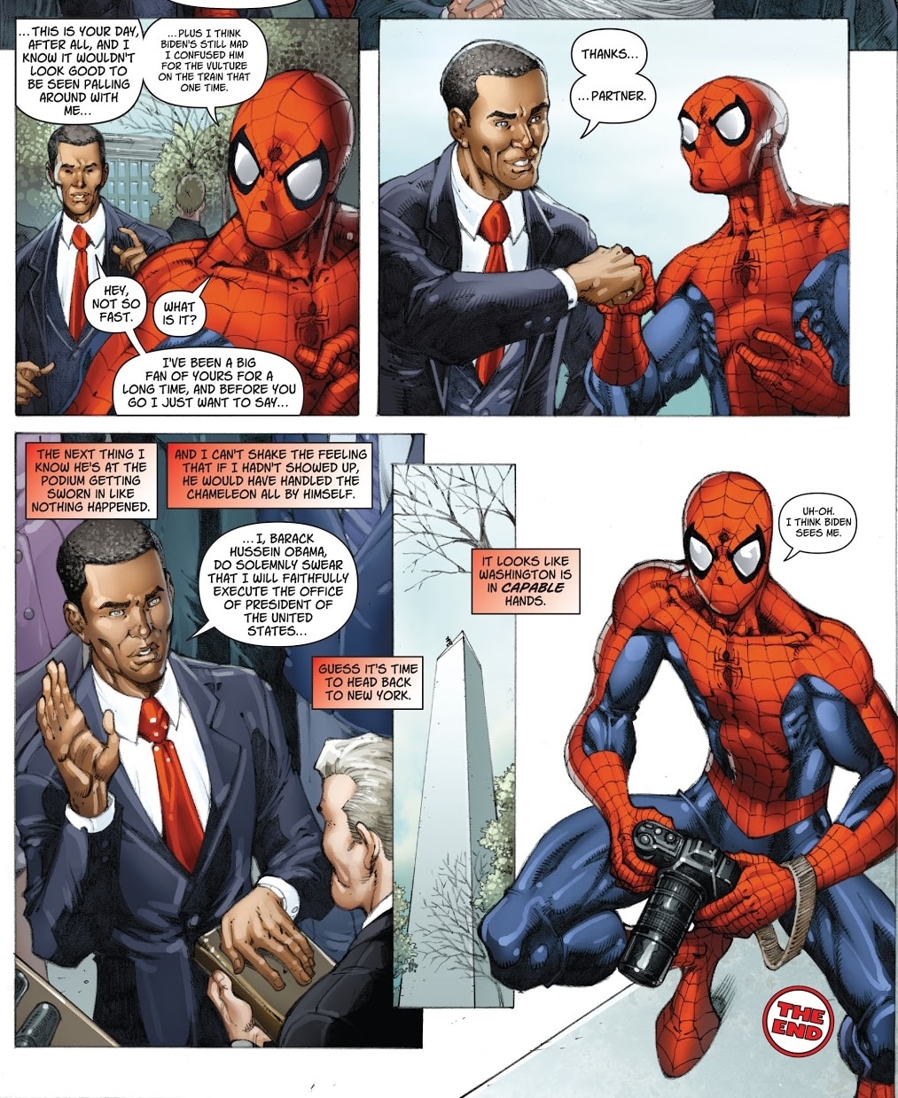 Spidey Meets the President! appeared in The Amazing Spider-Man #583, was written by Zeb Wells, with art by Todd Nauck and Frank D'Armata, and published on the 14th January 2009, a week before Obama's inauguration.