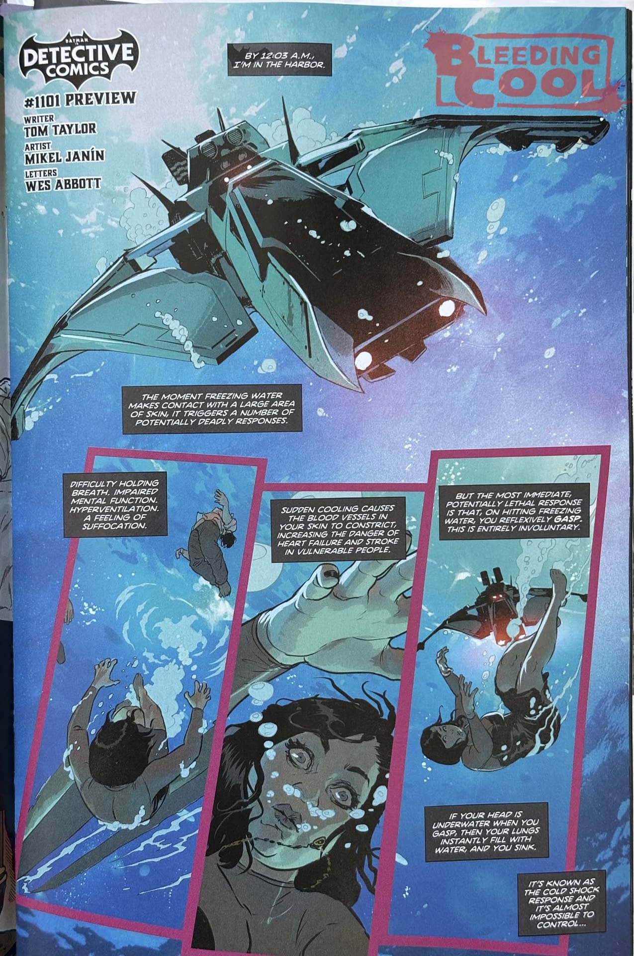 Detective Comics #1101 by Tom Taylor and Mikel Janin is published in one-and-a-bit weeks on the 24th of September. A preview would have run in the Gotham Sampler for Batman Day. However, that has now been withdrawn by comic book stores by DC Comics. So… maybe Bleeding Cool can jump in? Here is that preview in full… as Batman takes the Batsub on a rescue mission into the ocean. Demarcation for Aquaman there? We know he's been a bit jumpy of late. As in, jumping all the way from the Justice League Watchtower to the ocean for a start…