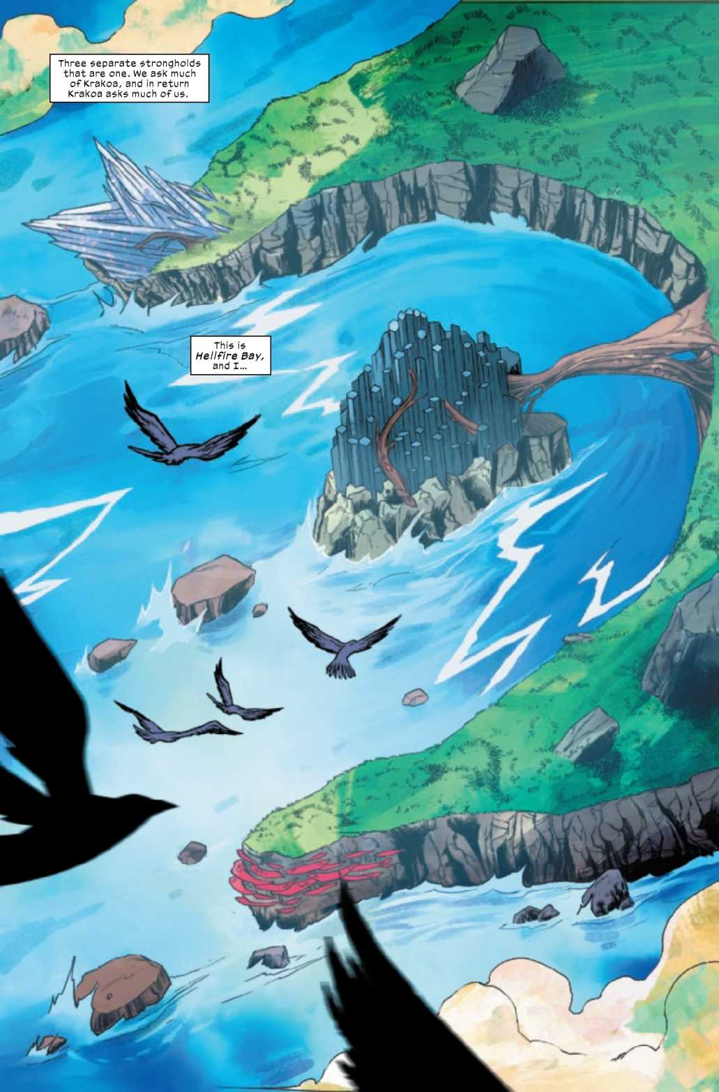 This issue focuses almost exclusively on Sebastian Shaw, who kicks off the issue by showing off Hellfire Bay, one of the premier Game -of-Thrones-inspired locations in Krakoa.