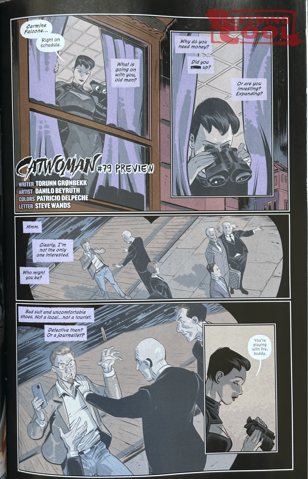 Catwoman #79 by Torunn Gronbekk and Danilo Beyruth is published this Wednesday. A preview was released last week. But did you know that if you had been allowed to pick up the Gotham Sampler for Batman Day, which has now been withdrawn from comic book stores by DC Comics, you would have had a completely different preview? No? Well, you do now. And here, because we are so very Bleeding Cool, is that very missing preview, with Selina Kyle spying on Carmine Falcone with binoculars, but she is no peeping tom, or even peeping tom cat, she has something very much different in mind for the Gotham gangster, who has his own confrontation by someone getting a little close with a soul patch. I mean, I get that…