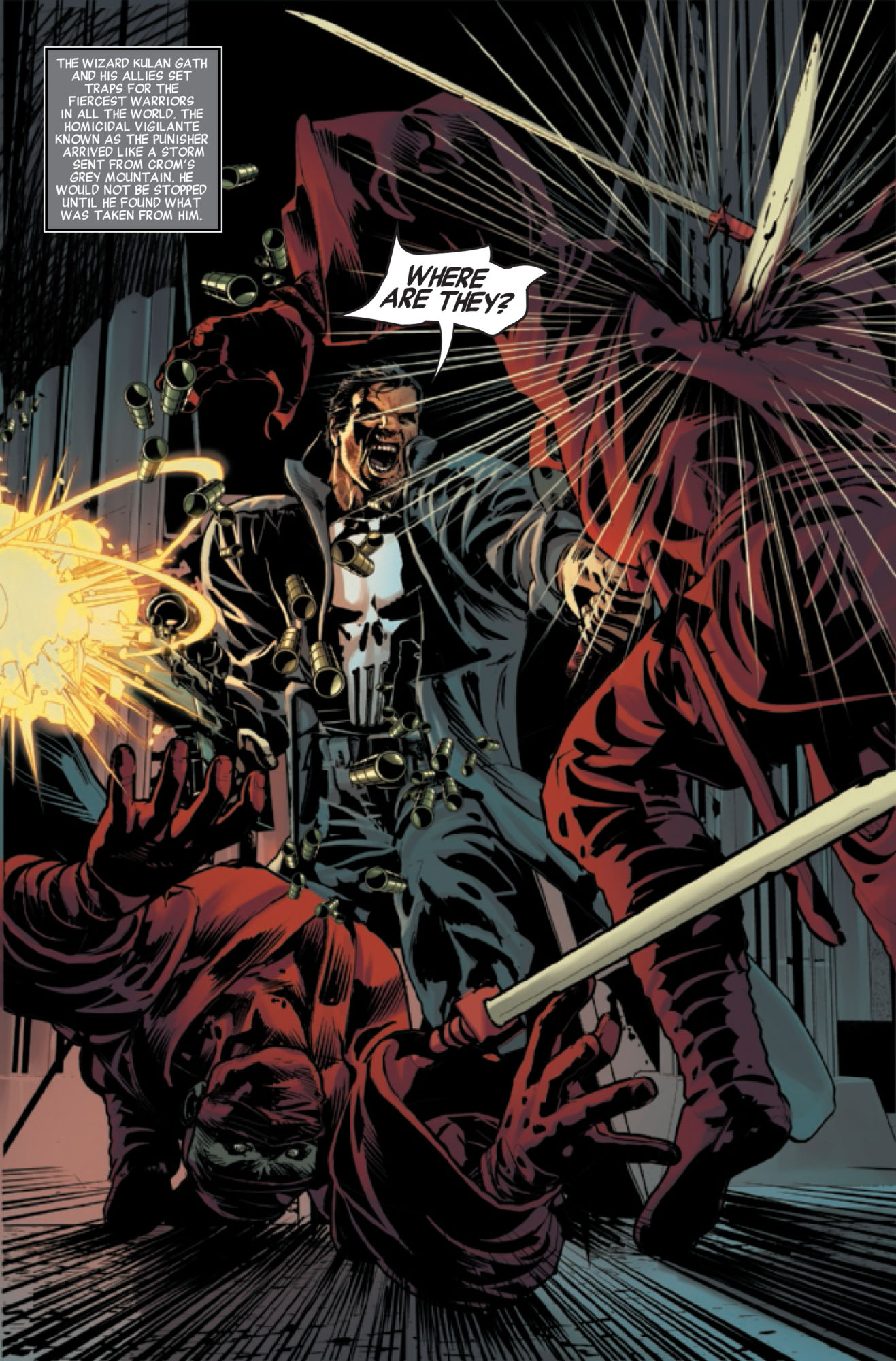 This week's Savage Avengers #3 sees the titular Savage Avengers one step closer to coming together in typical Marvel decompressed fashion, as we join the preview with a fight in progress between The Punisher and The Hand, who have teamed up with the wizard Kulan Gath in a story that will be an absolute licensing nightmare if Marvel ever loses the Conan license again.