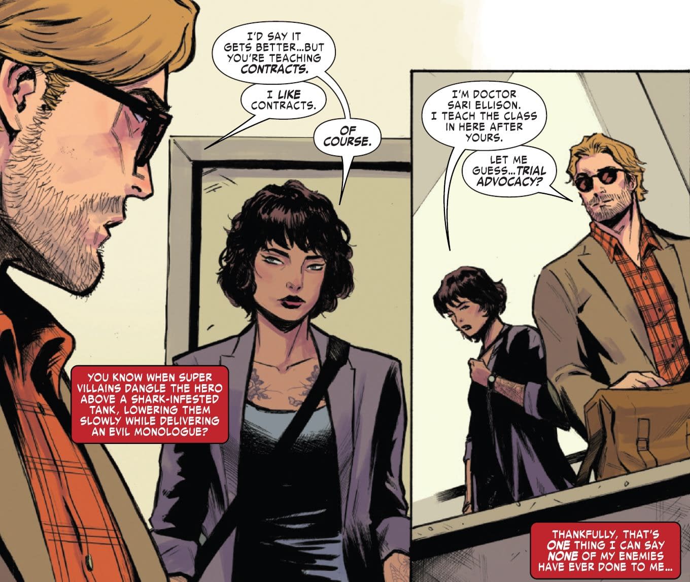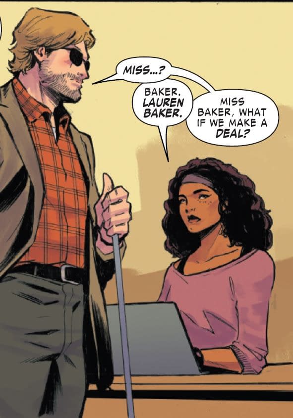 UPDATE: Daredevil #1 is published today… so we have updated the quality of the images in this article. The original version that ran earlier this week runs below: We ran the first page and the following few pages of this week's new Daredevil #1 by Stephanie Phillips and Lee Garbett, earlier with a new bad guy, The Omen, looking at the future of Daredevil and Matt Murdock, as Matt Murdock turns his talent to being a university lecturer. And that is where it looks like he might be finding a romantic interest…