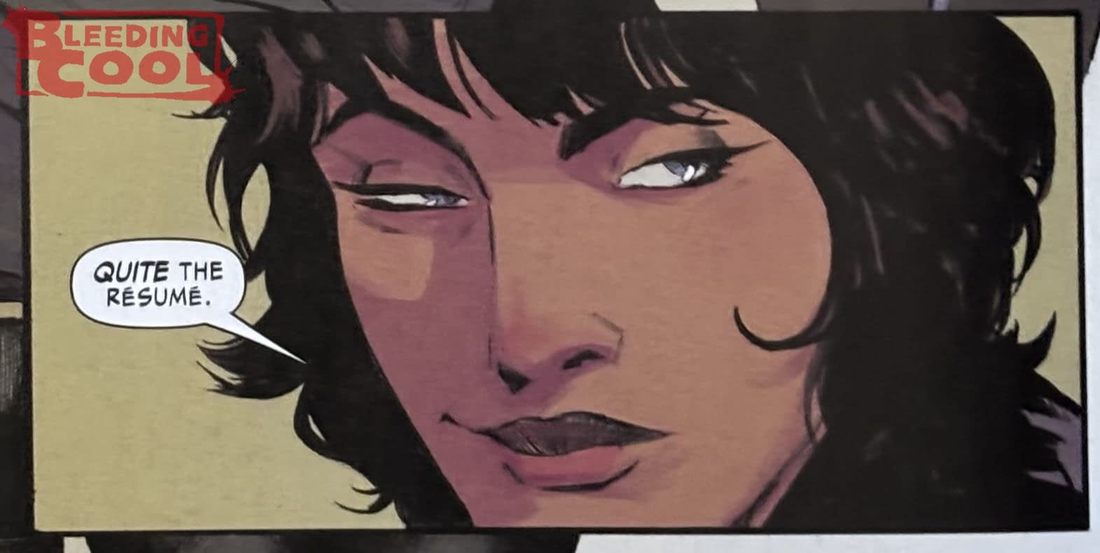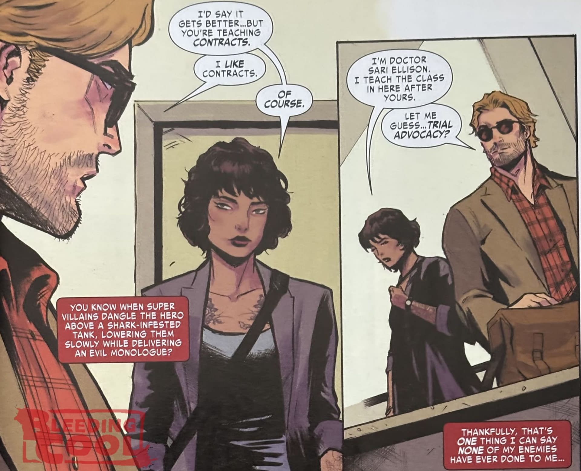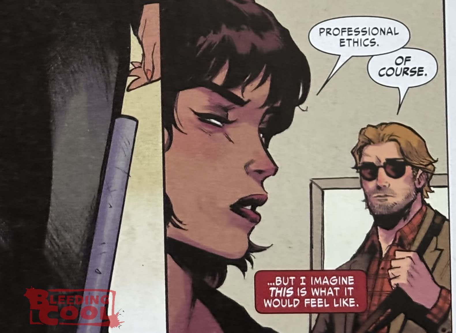 We ran the first page and the following few pages of this week's new Daredevil #1 by Stephanie Phillips and Lee Barnett, earlier with a new bad guy, The Omen, looking at the future of Daredevil and Matt Murdock, as Matt Murdock turns his talent to being a university lecturer. And that is where it looks like he might be finding a romantic interest…