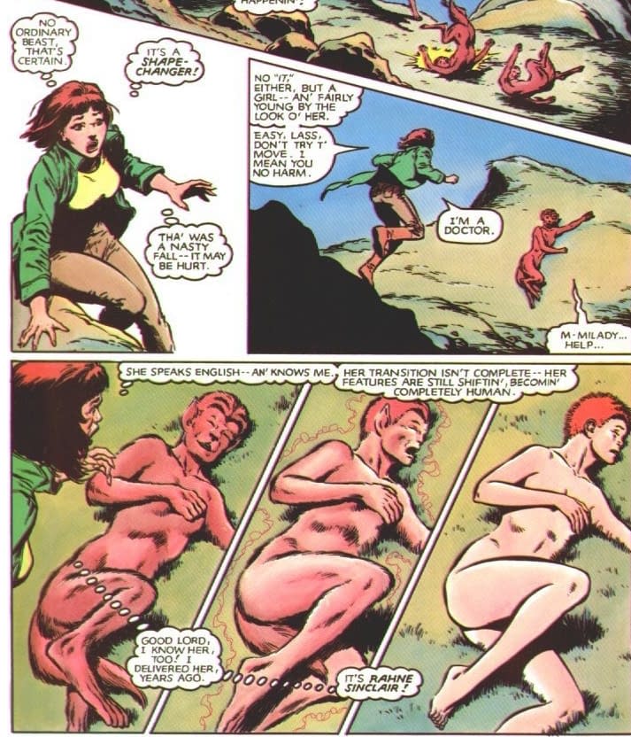 Jitter of the Outliers revisit a different time entirely. And giving us a (past) return of Moira Mactaggert… except I remember this scene. Or something very like it. From the original New Mutants graphic novel from 1982 by Chris Claremont and Bob McLeod, with Rahne Sinclair instead.
