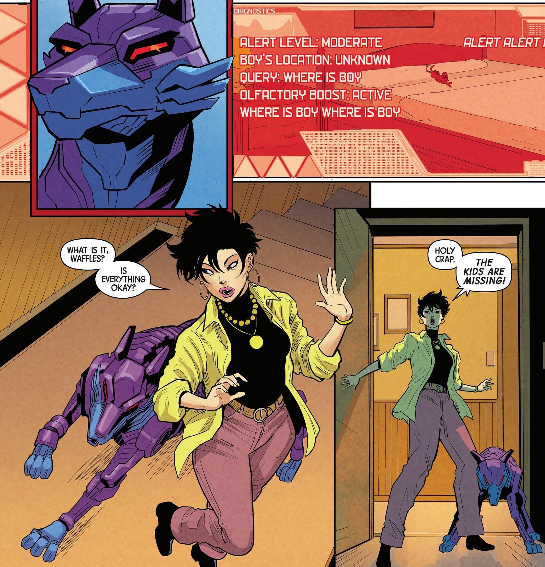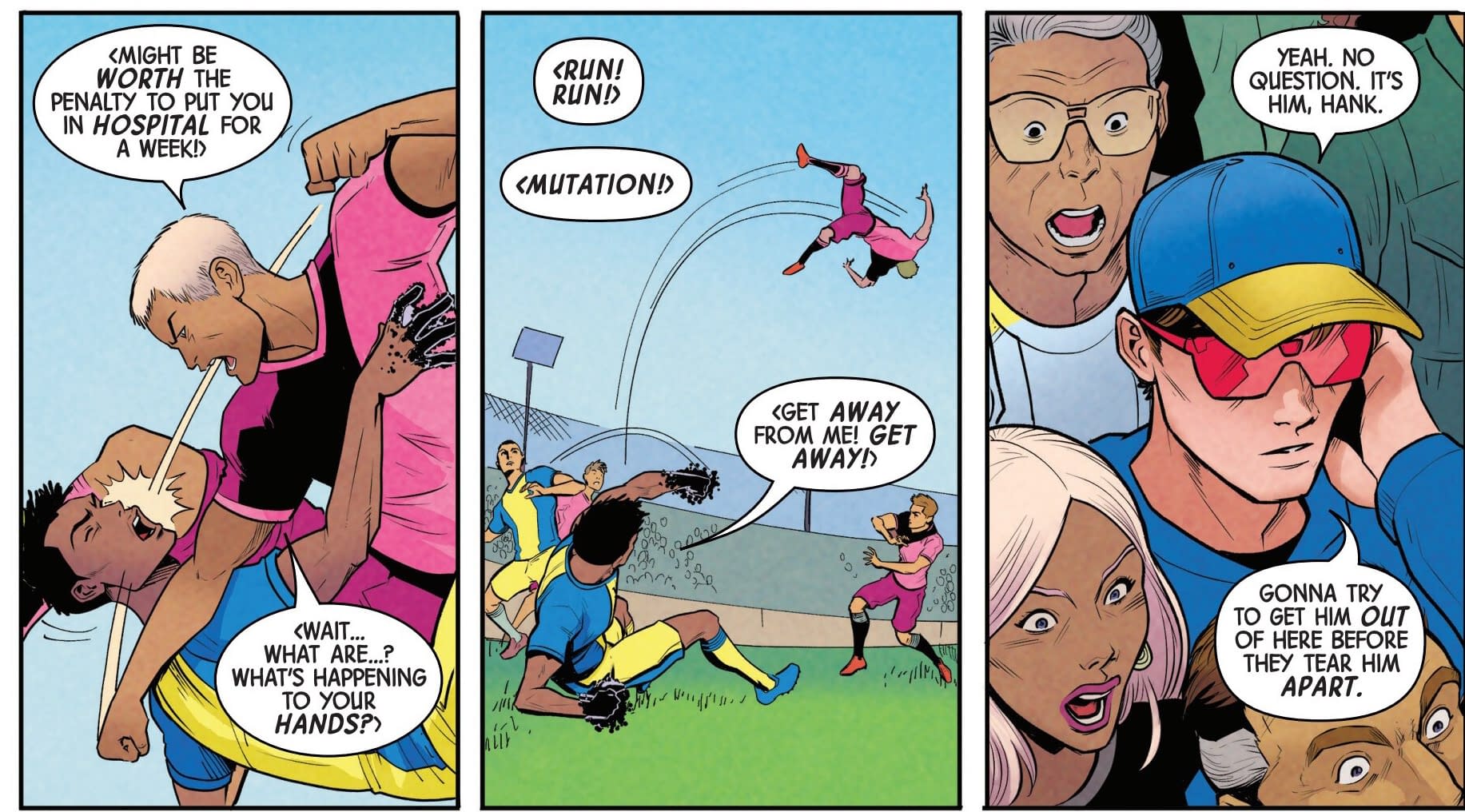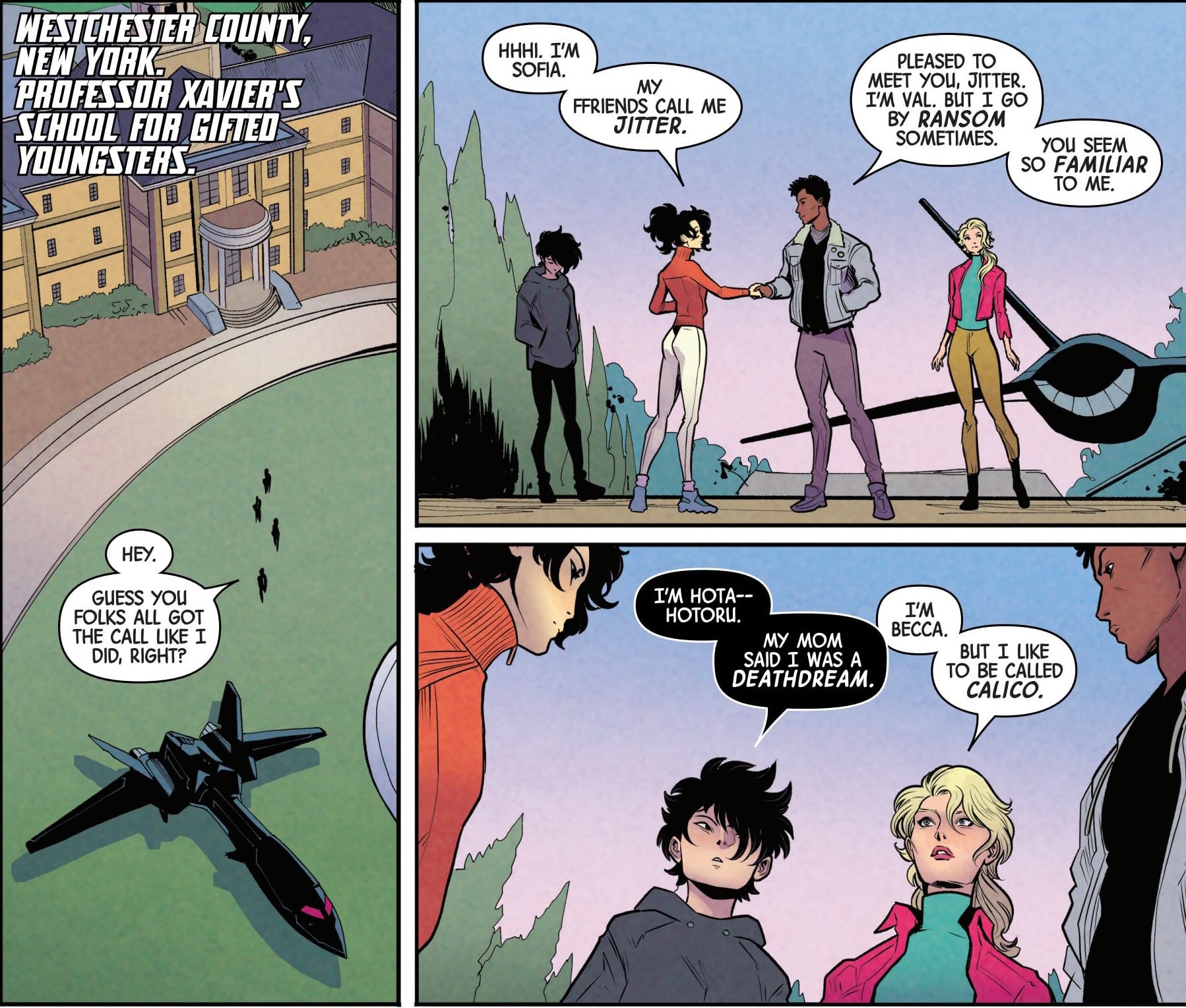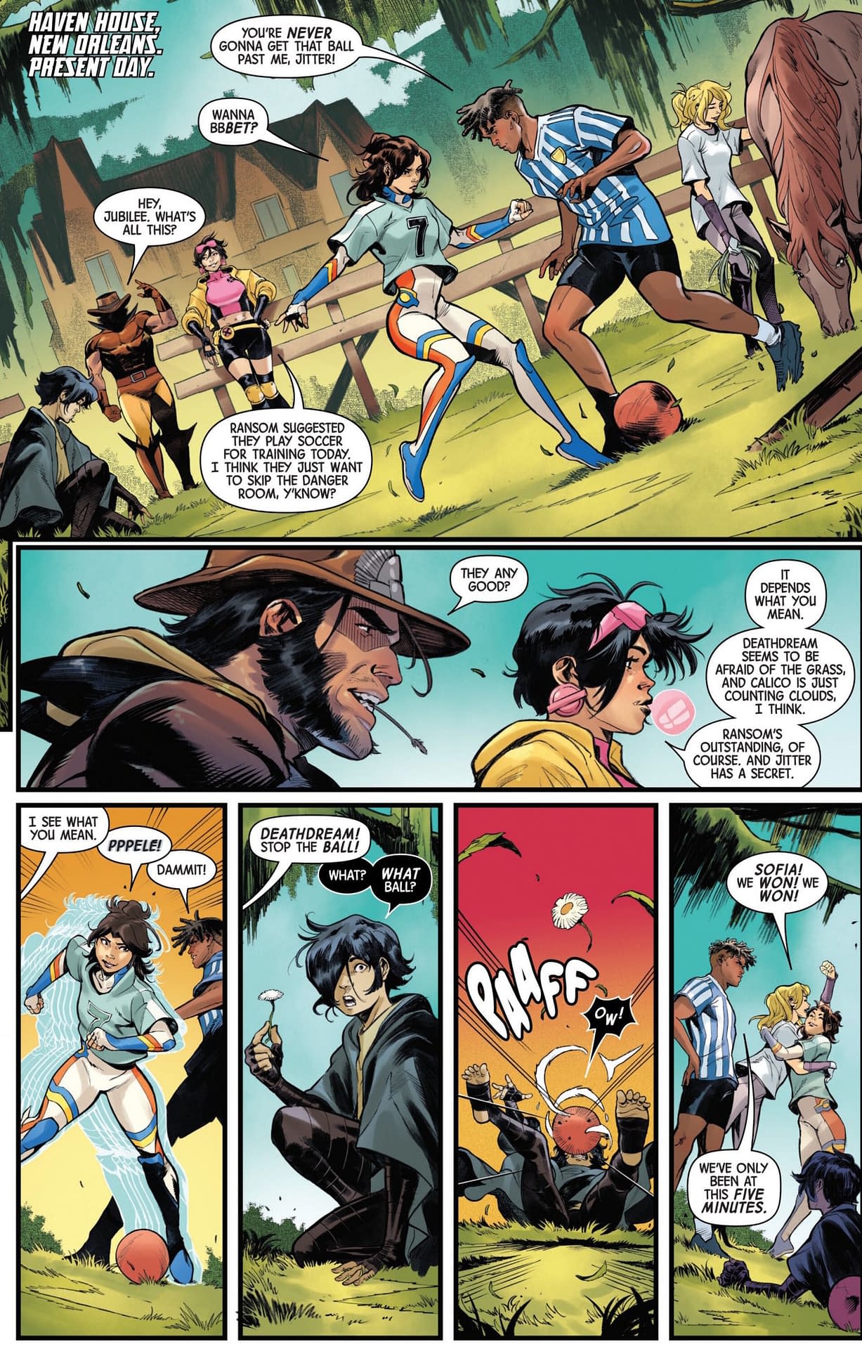 The first seems vaguely nostalgic, with Wolverine and Jubilee watching over The Outliers at Haven House, playing sports, giving very eighties vibes…