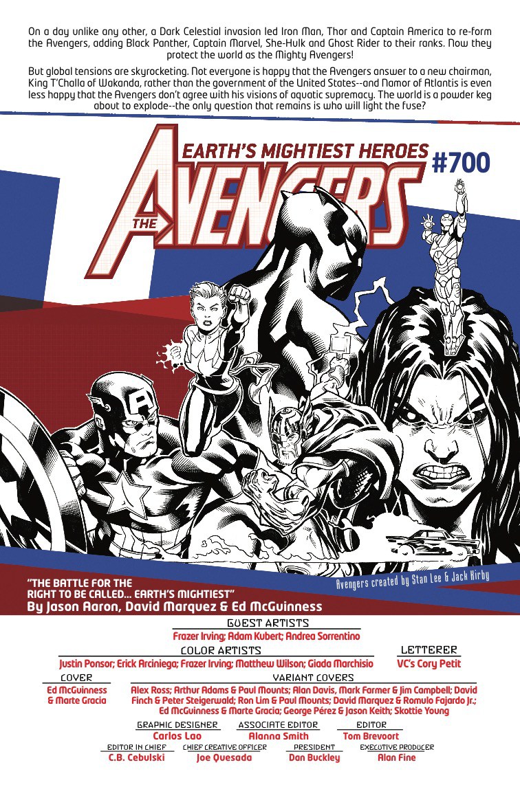 After 700 issues of saving the world, you'd think the Avengers would be due some celebration. But instead the whole world seems to be gunning for them, especially Namor's fearsome new Defenders of the Deep and the reimagined Russian Super-Soldiers of the Winter Guard. And that's not to mention the shocking surprise the U.S. government has in store for our heroes. Plus: The all-new Agents of Wakanda! The mystery of the Avengers of 1,000,000 BC deepens! A key revelation concerning the resurrection of Wolverine! And the next startling new Avenger is revealed!