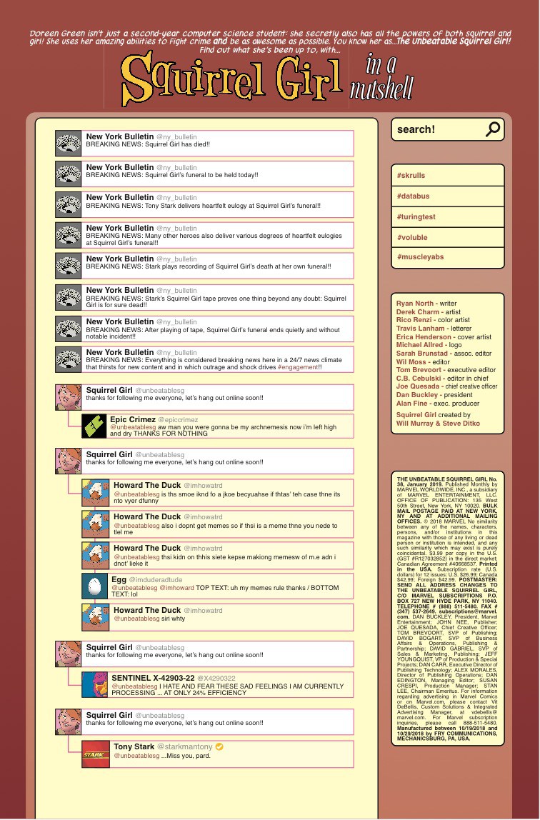Squirrel Girl is not dead, despite the claims made by the cover of last issue, but a more sinister plot may be menacing the Marvel Universe, if this preview of next week's Unbeatable Squirrel-Girl #38 has anything to say about it. Of course, we're talking about the menace of a super-mega-crossover event sequel!