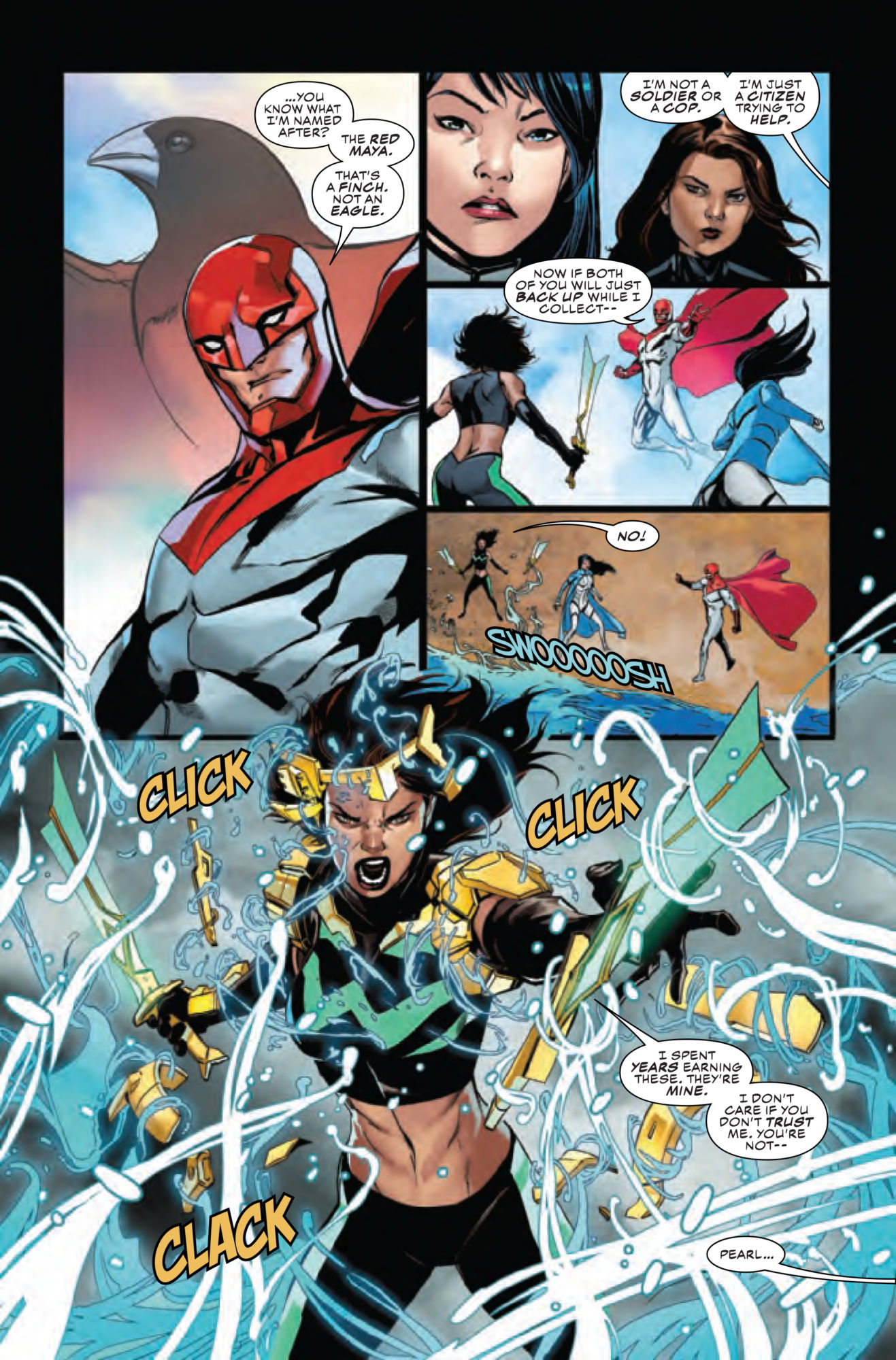 A preview of Aero #2 offers an interesting predicament for superhero human resources departments. Red Feather, leader of Triumph Division, wants to fire Wave from the Philippines' biggest superhero team. But when he arrives on the scene and demands she turn over her weapons, things don't go quite as planned…