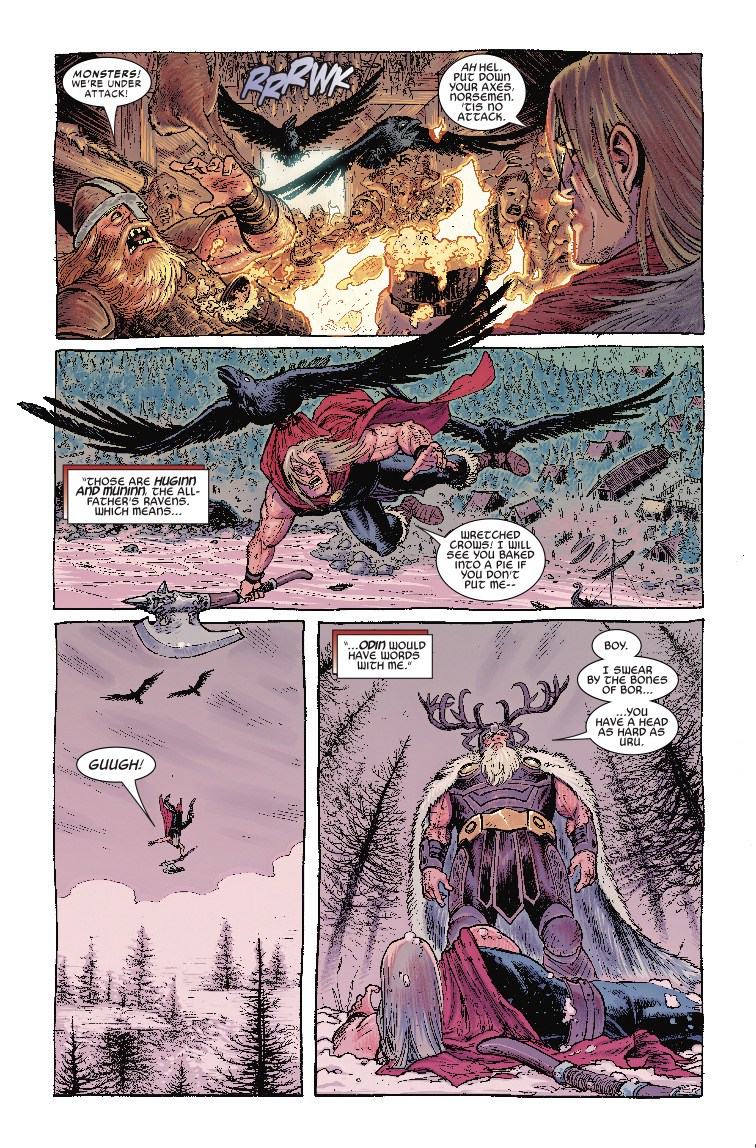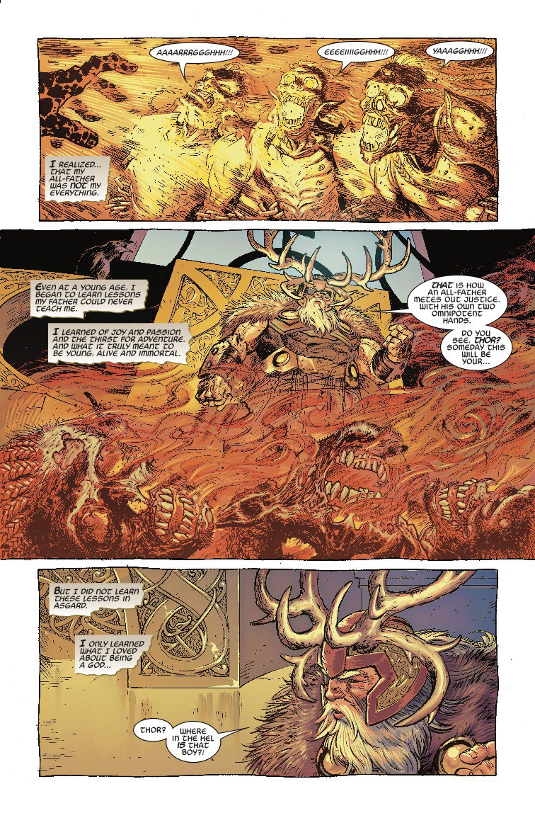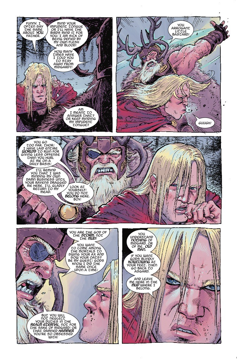 We've always known the relationship between Thor and his pop, Odin, has been a little tense, but in a story set in the past in next week's Thor #7, we get a taste of just how bad a dad Odin can be. Angry at his son for neglecting his Asgardian duties (heh… doodies) to pal around with mortals on Midgard, Odin summons Thor for a little father/son chat.