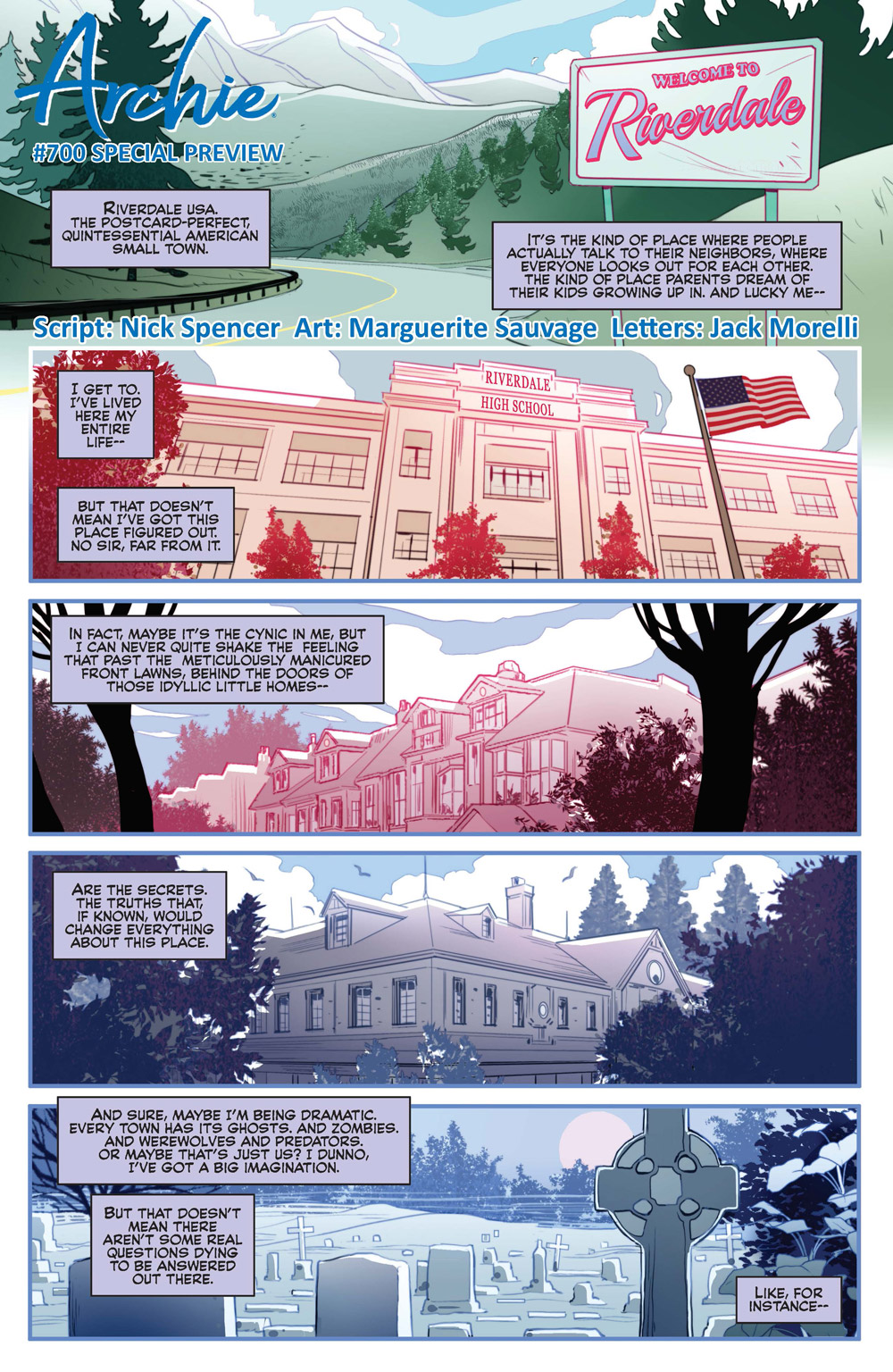 Ahead of New York Comic Con, Archie Comics has released a preview of Archie #700, the first issue in a bold new era for the series that seems like it wasn't rebooted to a new #1 too long ago. Along with a shiny new legacy number, Archie is getting a new creative team: writer Nick Spencer and artist Marguerite Sauvage.