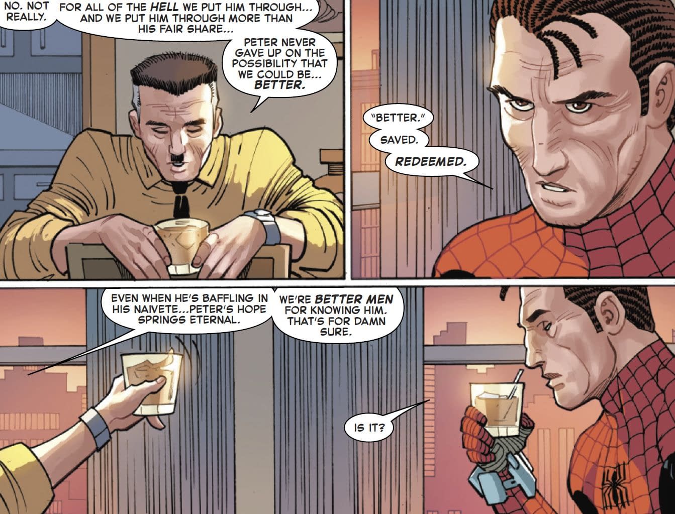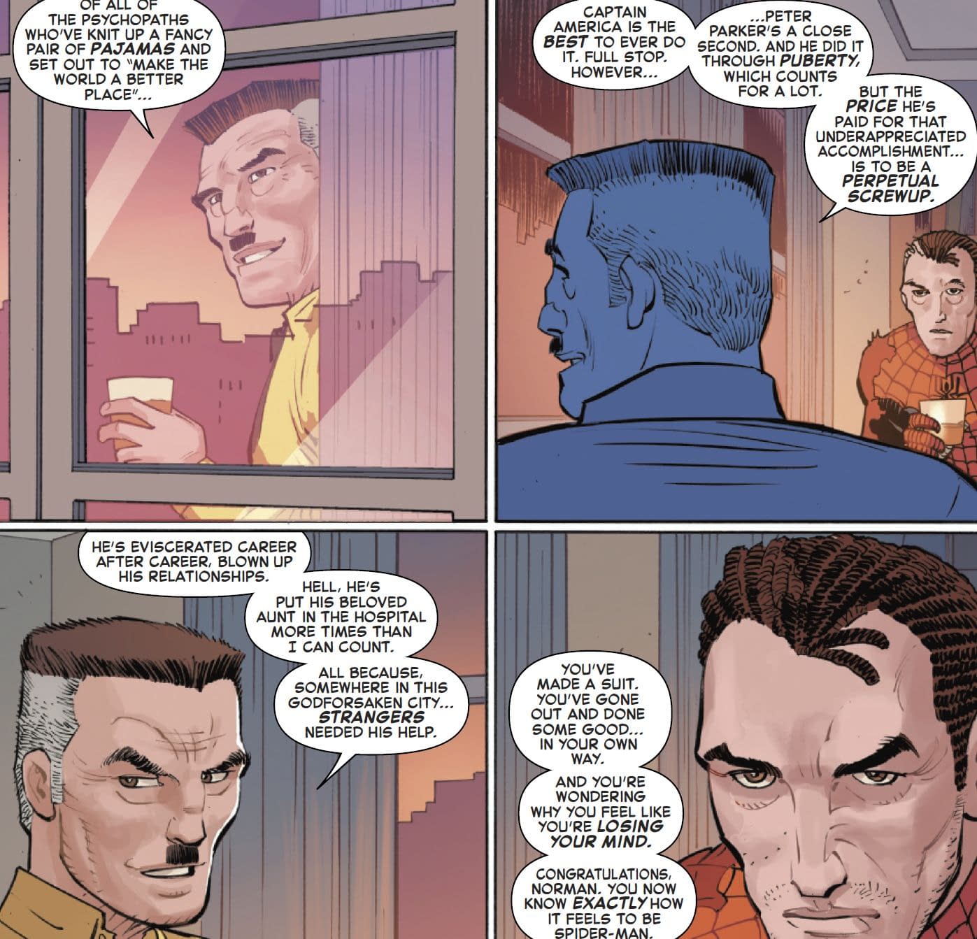 Of course now that J Jonah Jameson knows who Spider-Man is, and Norman Osborn has been on an even bigger journey, their admiration for Spider-Man, for Peter Parker, is brought them closer together…