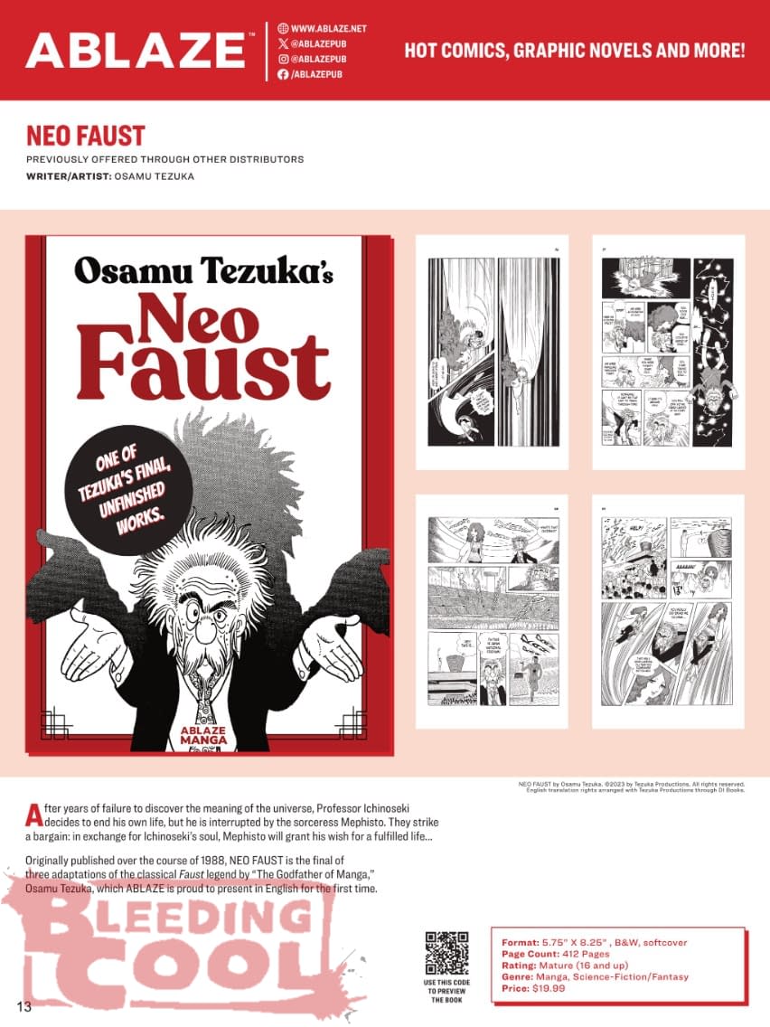 After years of failure to discover the meaning of the universe, Professor Ichinoseki decides to end his own life, but he is interrupted by the sorceress Mephisto. They strike a bargain: in exchange for Ichinoseki's soul, Mephisto will grant his wish for a fulfilled life… Originally published over the course of 1988, NEO FAUST is the final of three adaptations of the classical Faust legend by "The Godfather of Manga," Osamu Tezuka, which ABLAZE is proud to present in English for the first time.