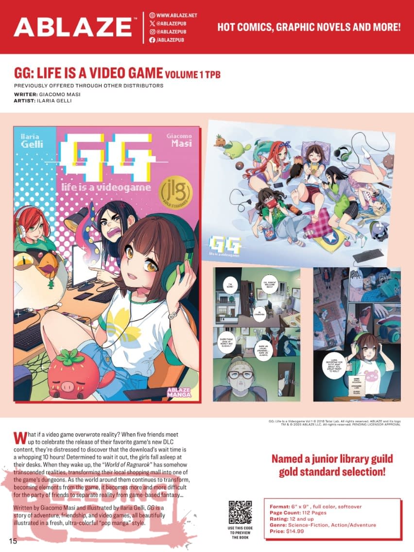 What if a video game overwrote reality? When five friends meet up to celebrate the release of their favorite game's new DLC content, they're distressed to discover that the download's wait time is a whopping 10 hours! Determined to wait it out, the girls fall asleep at their desks. When they wake up, the "World of Ragnarok" has somehow transcended realities, transforming their local shopping mall into one of the game's dungeons. As the world around them continues to transform, becoming elements from the game, it becomes more and more difficult for the party of friends to separate reality from game-based fantasy… Written by Giacomo Masi and illustrated by Ilaria Gelli, GG is a story of adventure, friendship, and video games, all beautifully illustrated in a fresh, ultra-colorful "pop manga" style.