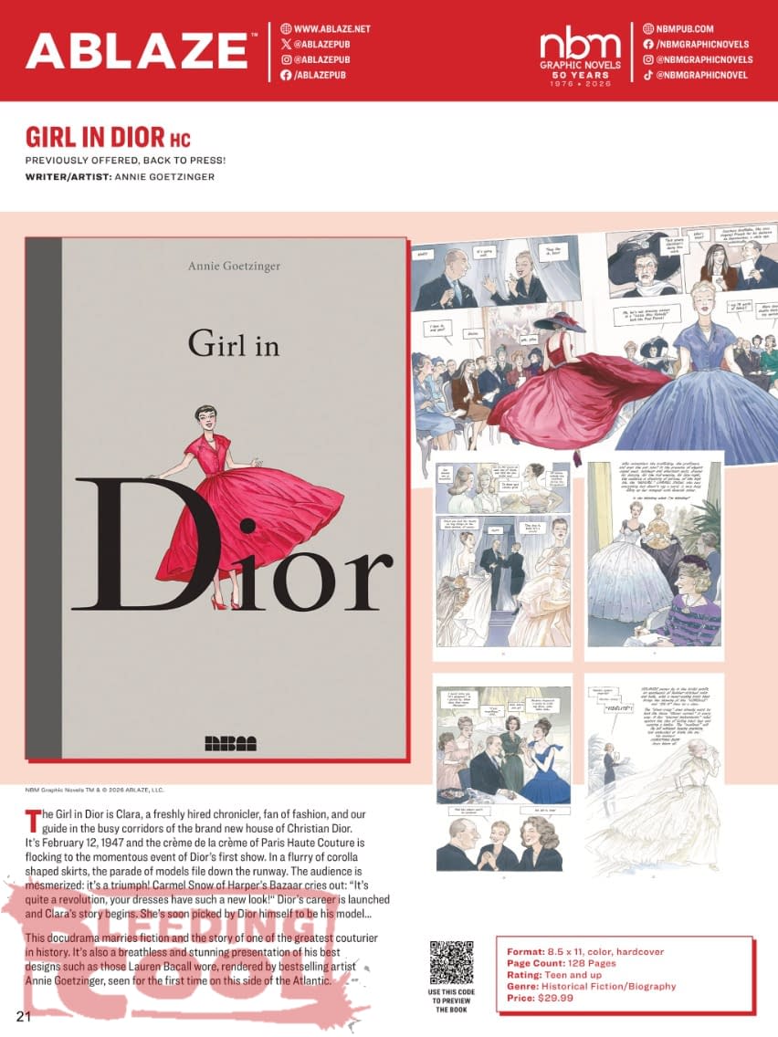 The Girl in Dior is Clara, a freshly hired chronicler, fan of fashion and our guide in the busy corridors of the brand new house of Christian Dior. It's February 12, 1947, and the crème de la crème of Paris Haute Couture is flocking to the momentous event of Dior's first show. In a flurry of corolla-shaped skirts, the parade of models file down the runway. The audience is mesmerized: it's a triumph! Carmel Snow of Harper's Bazaar cries out: "It's quite a revolution, your dresses have such a new look!" Dior's career is launched, and Clara's story begins. Soon, she is picked by Dior himself to be his model… A biography docudrama marrying fiction and the story of one of the greatest couturier in history, this book is also a breathless and stunning presentation of his best designs such as those Lauren Bacall wore, rendered by bestselling artist Annie Goetzinger, seen for the first time on this side of the Atlantic. Retail: $29.99