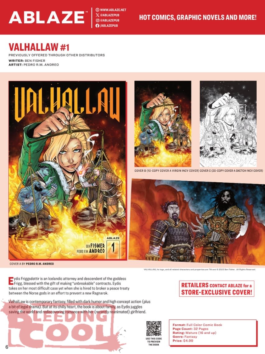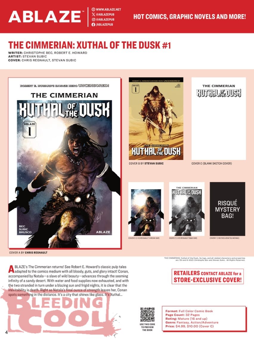 Ablaze comes to Lunar Distribution in July 2026, with a new Conan comic, The Cimmerian: Xuthal Of Dusk #1, and Christophe Bec based on the Robert E Howard original, drawn by Stevan Subic, as well as the Norse god legal parody Valhallaw #1 by Ben Fisher and Pedro R M Andreo…