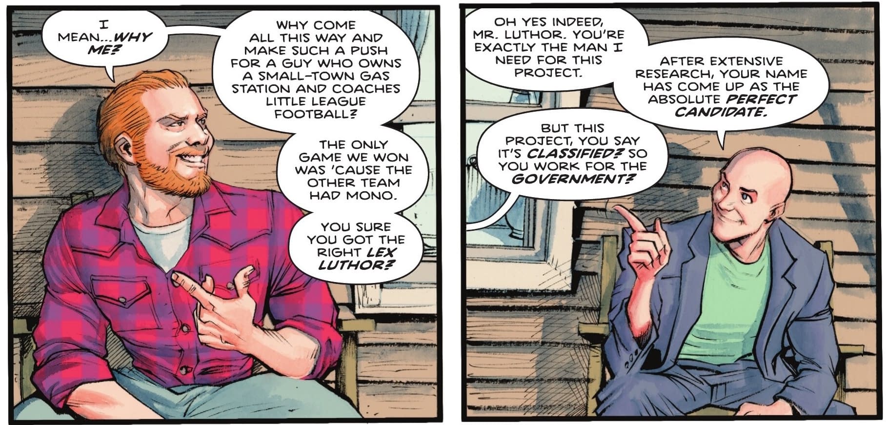 Brainiac is trying to start up the old Luthor/Brainiac team-up. But it seems that in a world without Superman (until a lot later), we got a very different Lex Luthor. One with hair, for starters.