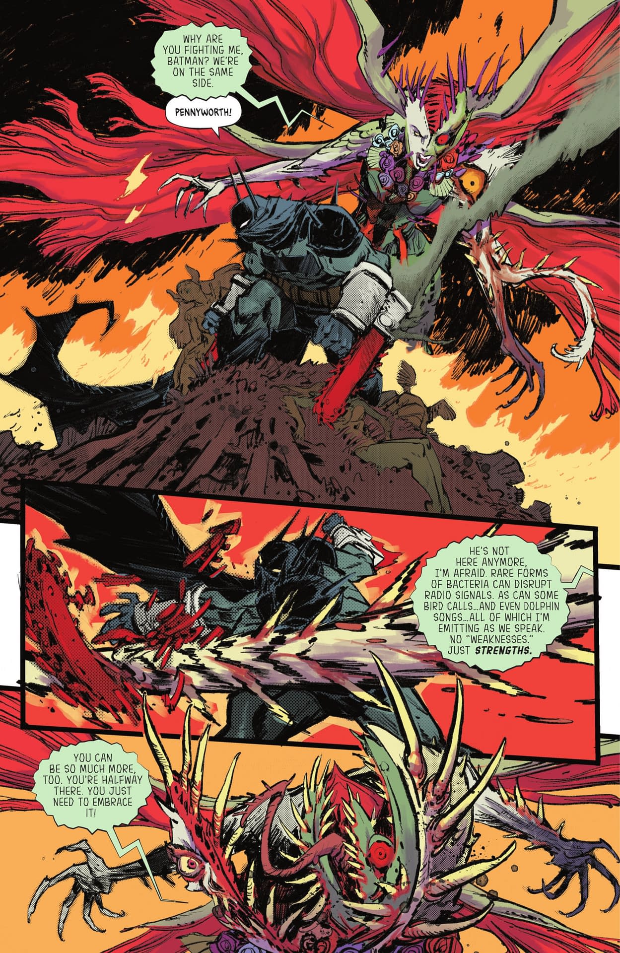"I was really interested in the idea of things that kind of surprise you by how much more they can do than you think, like jellyfish being able to reverse their lives. I read about all these crazy plants that can survive nuclear blasts and the idea was to take Ivy and instead of just having her be The Green… and I love all those stories but you've seen it with Swamp Thing too, like when he takes over Gotham, well what if you just level her up and instead of her research stopping at plants, she's like what if I start combining animals and insects and every kingdom. That's why it's the seven kingdoms of life. And so she is the avatar almost of everything in our series. And she hasn't even… she's just growing…. she comes back in a big way."