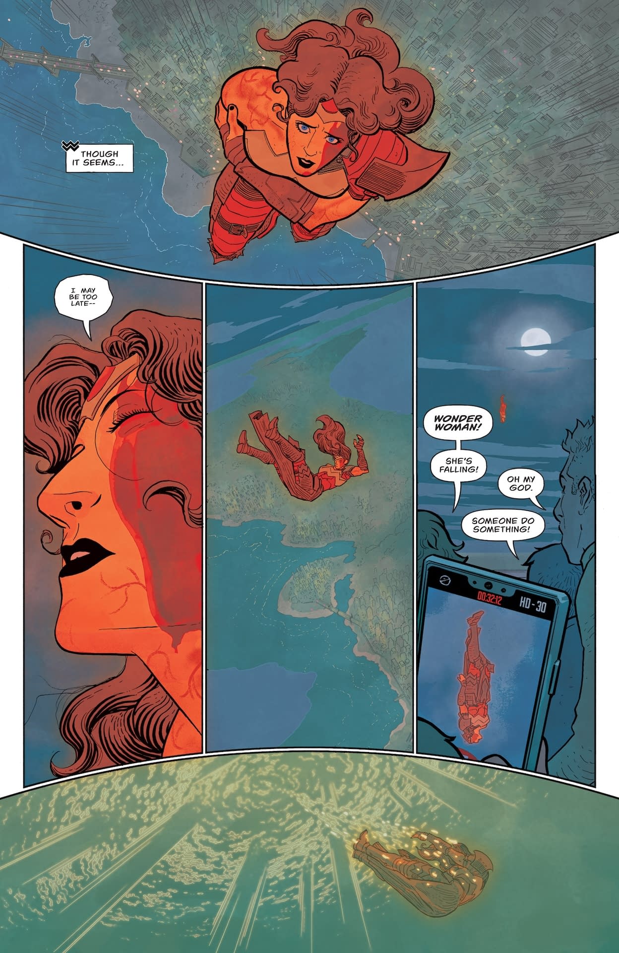 - Preview pages show Diana battling skeletal manifestations and falling into the ocean before encountering Zatanna at the Hieron.