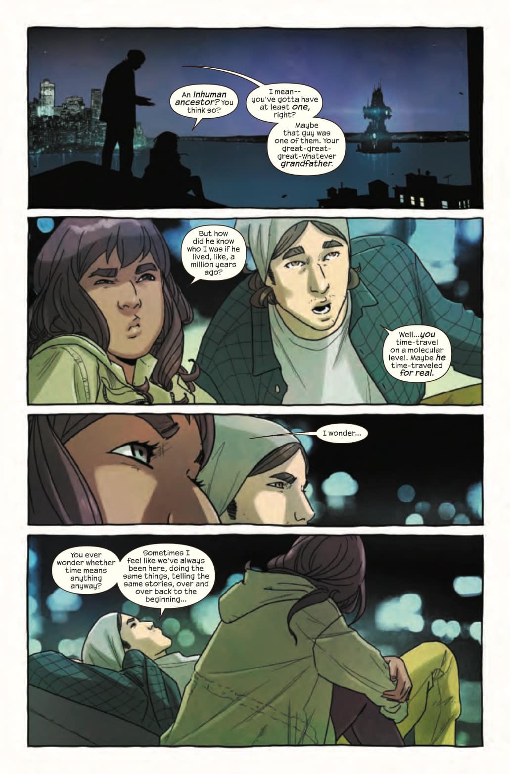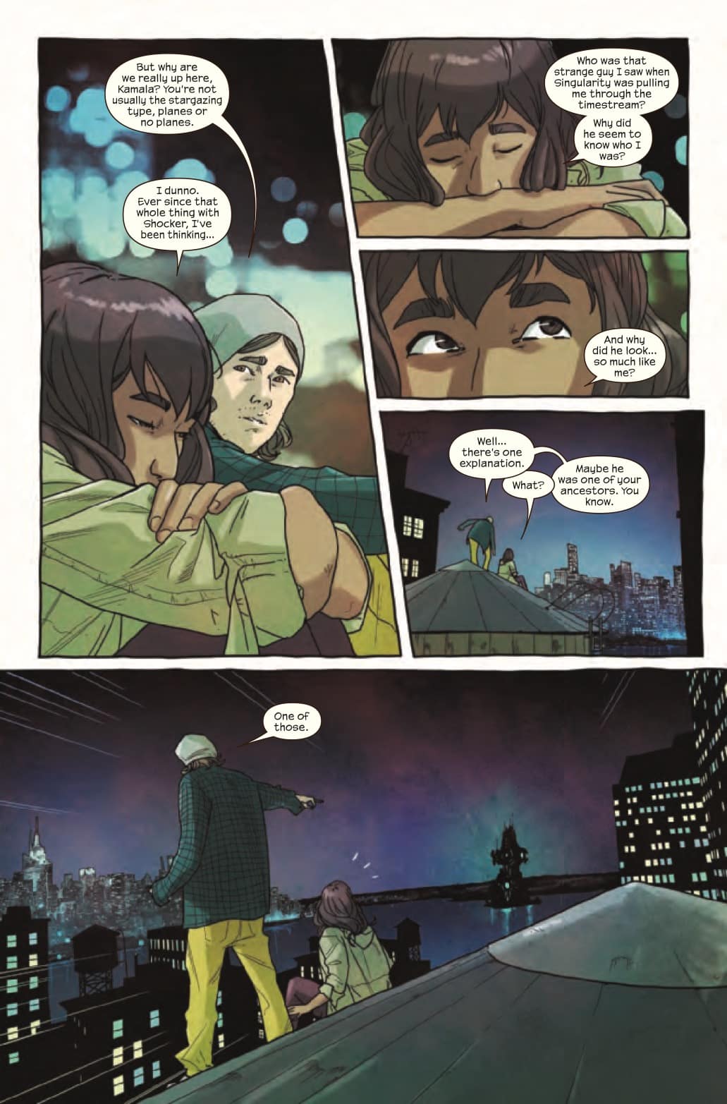 Sitting and watching the planes take off and land at LaGuardia airport, Kamala and Bruno discuss Ms. Marvel's powers, her Inhuman ancestry, and the nature of time travel, causing Bruno to wonder: