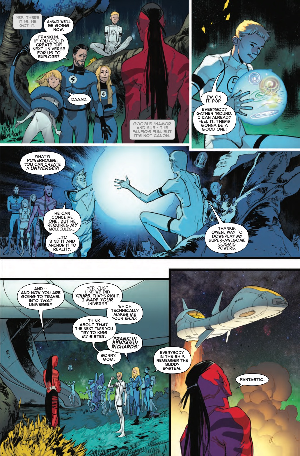 The Marvel Universe may ship Reed and Sue, but Namor definitely ships Sue and Namor. In a preview of Fantastic Four #2 just released, we do see Reed and Sue. We do not see the Fantastic Four actually reunited in their own book, at least not yet. We do see an older Valeria and Franklin Richards, and what they've been up to: rebuilding the multiverse, and fielding a marriage proposal, respectively. And they've been at it for a long time. But most importantly, Sue addresses the authenticity of Namor/Sue fanfic: fun, but not canon.