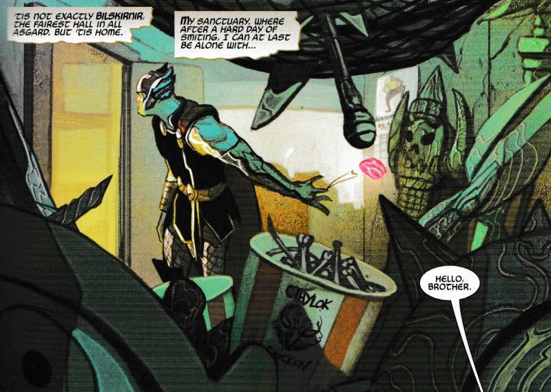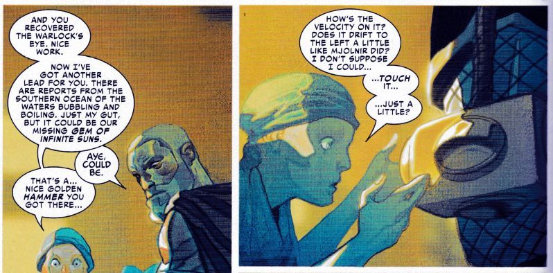 And so, in beautifully rendered painted panels, Thor is further defined by all those he meets. Those from his past, present and future. Including the last to wield Mjolnir — who now has a little of the Gollum about her.