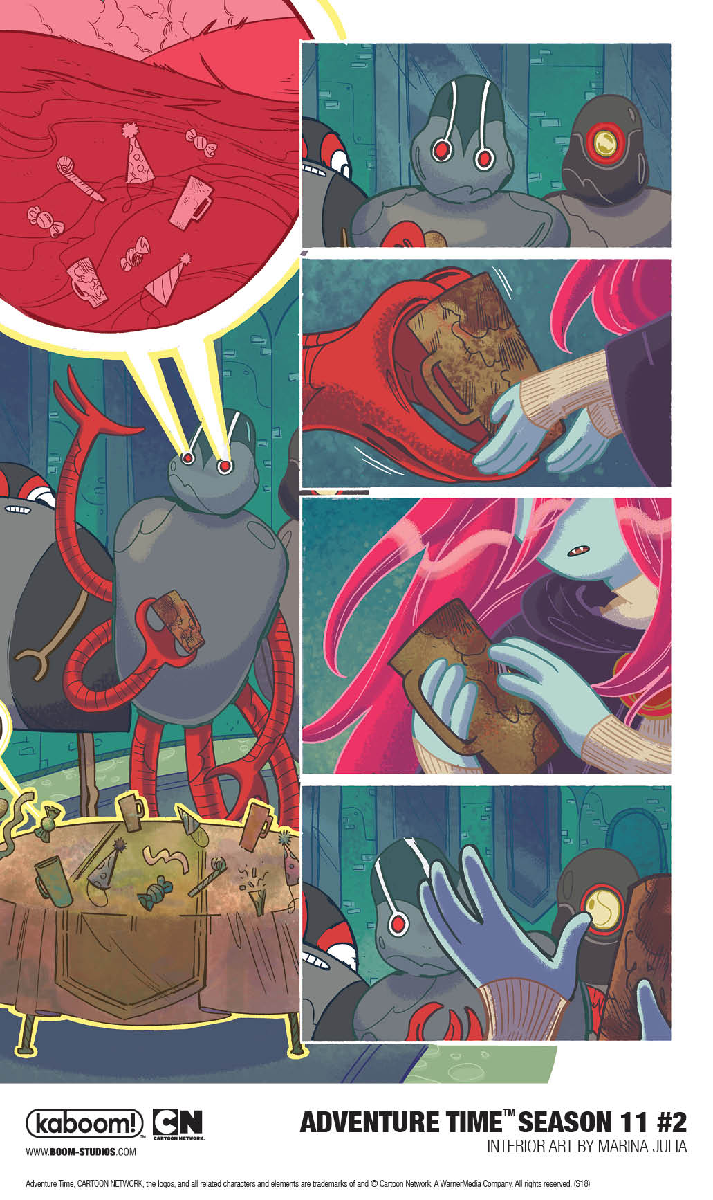 Explosive publisher BOOM! Studios has released a first look preview at Aventure Time Season 11 #2, the comic that officially continues the award-winning Cartoon Network series' continuity. Written by Sonny Liew and Ted Anderson with art by Marina Julia, the comic is published under BOOM!'s middle-grade KaBOOM! imprint, and #2 will feature a cover by Jorge Corona and variants by Jakub Rebelka and Julie Benbassat.