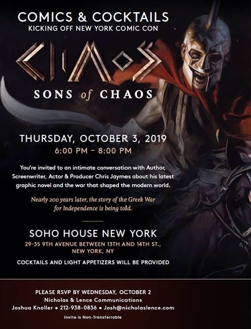Comics and Cocktails, a conversation with Actor, Writer, Screenwriter and Producer Chris Jaymes and Author of the new Graphic Novel Sons of Chaos. S0ho House New York, 29-35 9th Avenue. Invite Only.