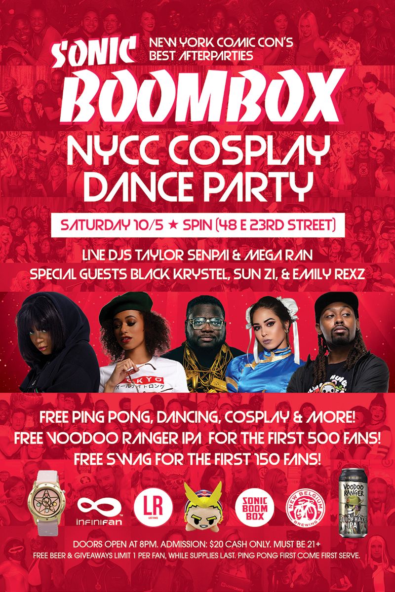 Sonicboombox NYCC 2019 Cosplay Dance Party, Spin, 48 E 23rd St, 8pm-2am, $15 advance, two for $20, $30 cash on door.