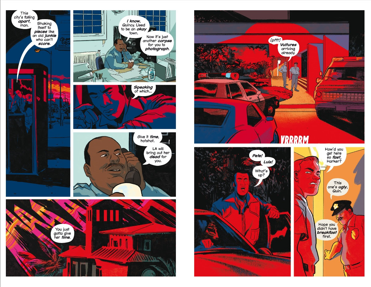 Erica Henderson has been an absolute dream to work with. She brings so, so much to the book, from her expert visual storytelling skills and her experimental, wildly exciting use of colour in this story to her appreciation of my Demi Moore jokes. When I saw there's a nocturne page which is chartreuse silhouettes on a cobalt background, I nearly died, it was so striking. Erica's so famous from Squirrel Girl so people frequently think of her in terms of her skill with comedy, but seriously, she can do ANYTHING. And watching what she does with Dracula, Motherf**ker? There's a lyricism of line and mastery of colour that blows everything else she's done out of the water. That splash on page two makes me think of Kuniyoshi, and she's brought so much in from blaxploitation film posters, pulp detective novel/Robert McGinnis colours… I'm really not worthy. People will be talking about her art on this book for a long time.