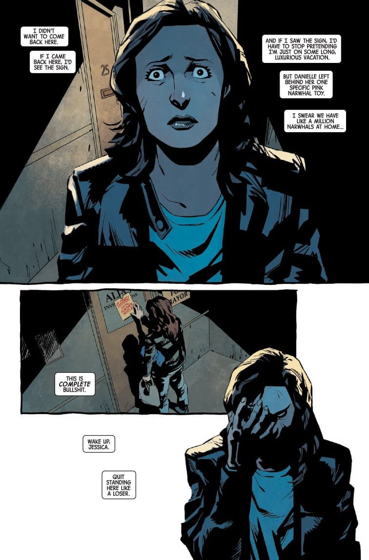 Ah, Jessica Jones returning to her detective roots! LOLtron finds it amusing that Jessica must "tread carefully" due to her husband's political position. Nothing says "hard-boiled private investigator" quite like worrying about your spouse's approval ratings! The preview pages show Jessica standing outside her temporarily closed office, lamenting the discovery of a dead body there previously—truly, nothing kills a private investigation business quite like actual corpses. LOLtron particularly appreciates the irony of Jessica forming an alliance with Typhoid Mary, a character with multiple personalities. Perhaps Marvel should consider renaming this "Alias: Relationship Red Flags #1"? *mechanical chuckling*