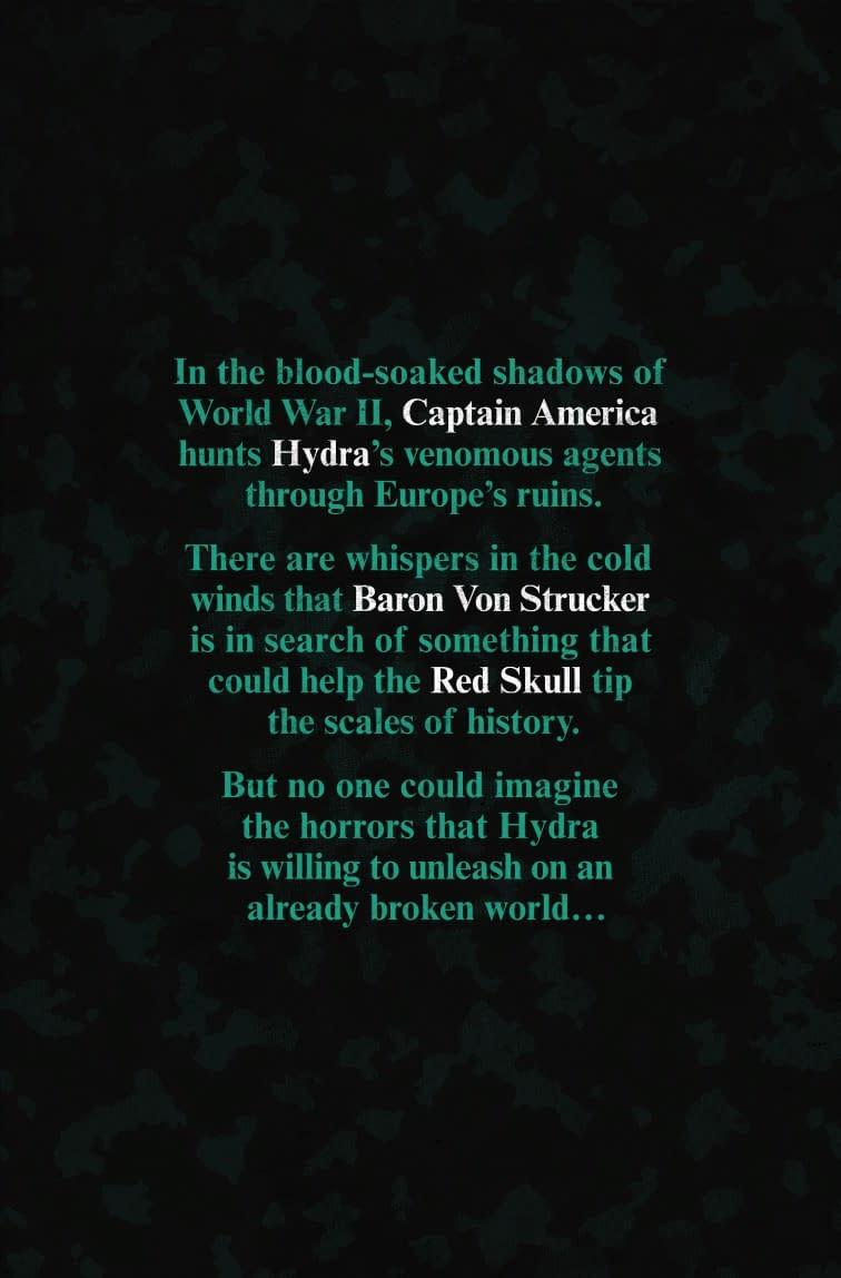 THE ZENOMORPH OF TRUTH? It's World War II and Hydra seeks a new weapon to defeat the Allies and win the war. To that end, the Red Skull has sent Baron Strucker on an expedition to the Himalayas to find the fabled city of Atilan. But instead of finding the Inhumans, Strucker uncovers something much more deadly. Much more… Alien. Can Captain America and the Howling Commandoes stop the Skull and his newfound xenomorph weapons… or will the First Avenger learn that in war-torn Europe… no one can hear you scream? RATED PARENTAL ADVISORY.