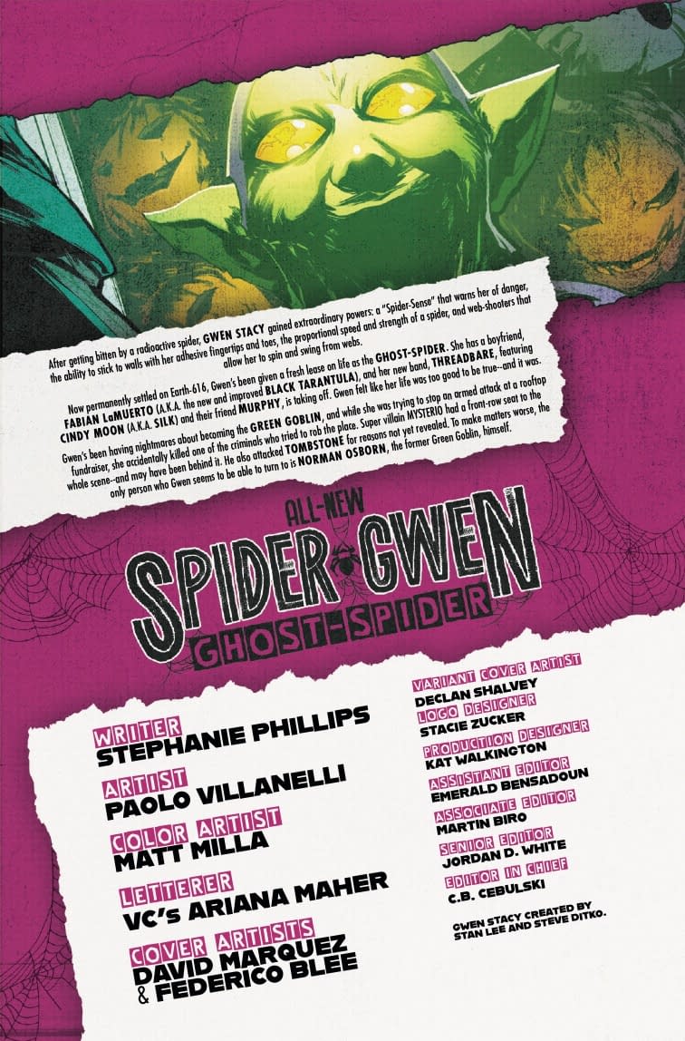 - Interior preview page from 75960621343600911 ALL-NEW SPIDER-GWEN: THE GHOST SPIDER #9 DAVID MARQUEZ COVER, by Stephanie Phillips & Paolo Villanelli & David Marquez, in stores Wednesday, April 1, 2026 from Marvel