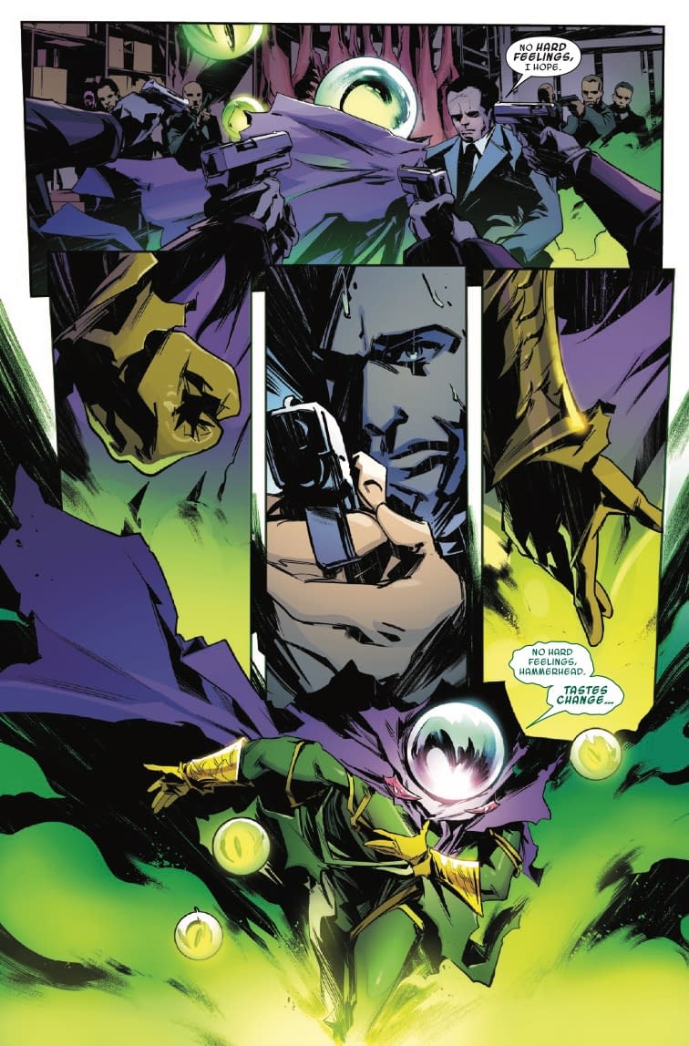- Preview pages show Mysterio being mocked by Hammerhead as a "washed-up villain for hire" before he pulls Spider-Gwen's strings in his theatrical manipulation scheme