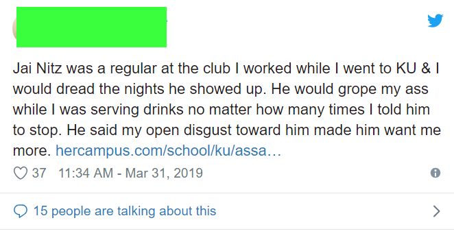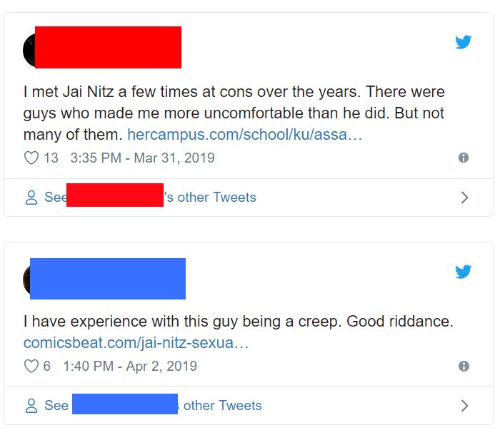 "Between Kara Love and I, we have tallied 13 people who have been assaulted/harrassed by Nitz or otherwise witnessed inappropriate behavior. I'm receiving messages from creators who know Jai personally, also, and have stated they had no knowledge of his misconducts but would be severing ties with him. I'm overwhelmed by the positive support I'm receiving, but also very surprised at the number of people coming forward."