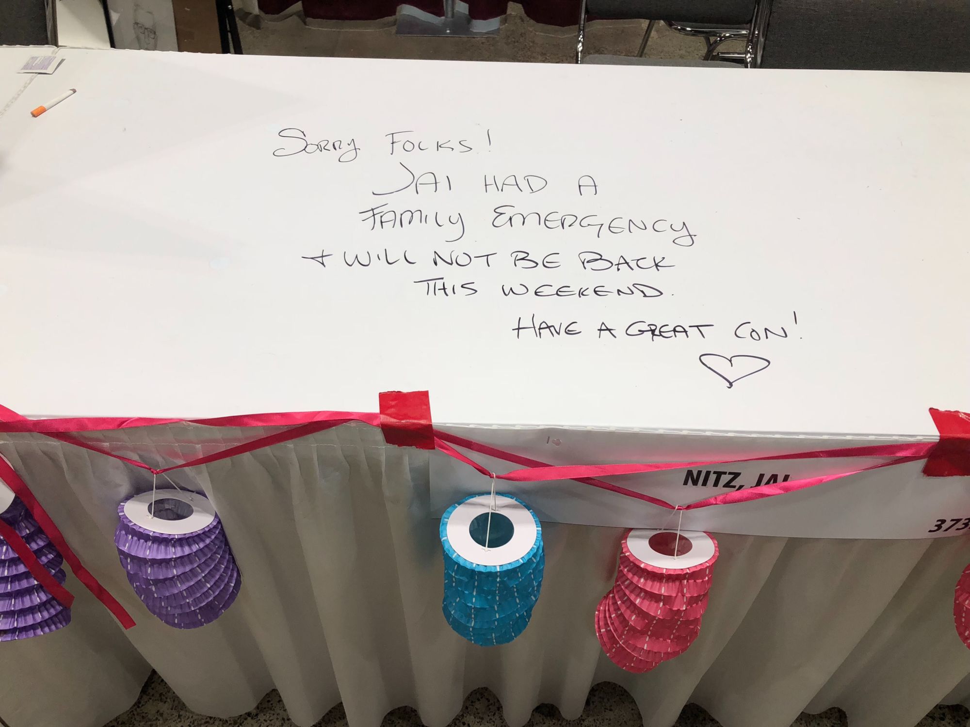 The day after the post was picked up across social media, Nitz pulled out of attending the show, with this note left on his table.