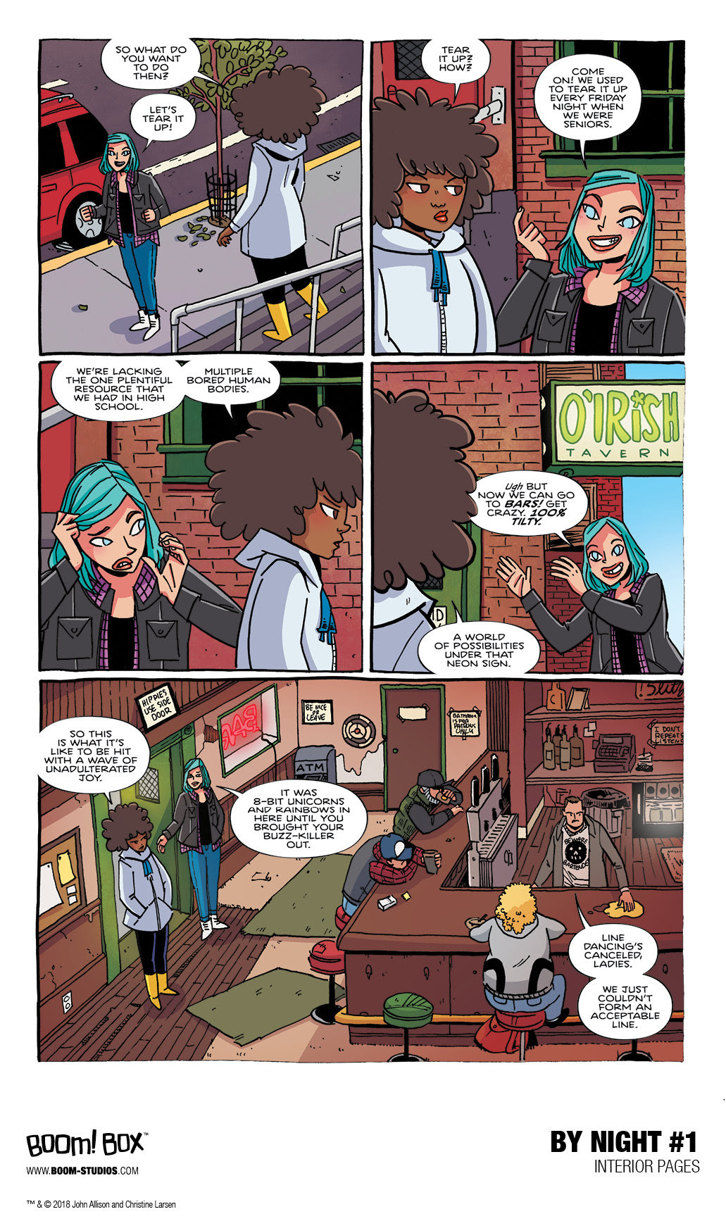 BOOM! Studios has announced a new 12-issue monthly series by John Allison and Christine Larsen called By Night, launching this June from the BOOM! Box imprint. Described as "about coming home, discovering identity, and accidentally smashing a hole to another dimension," the press release provides a series synopsis: