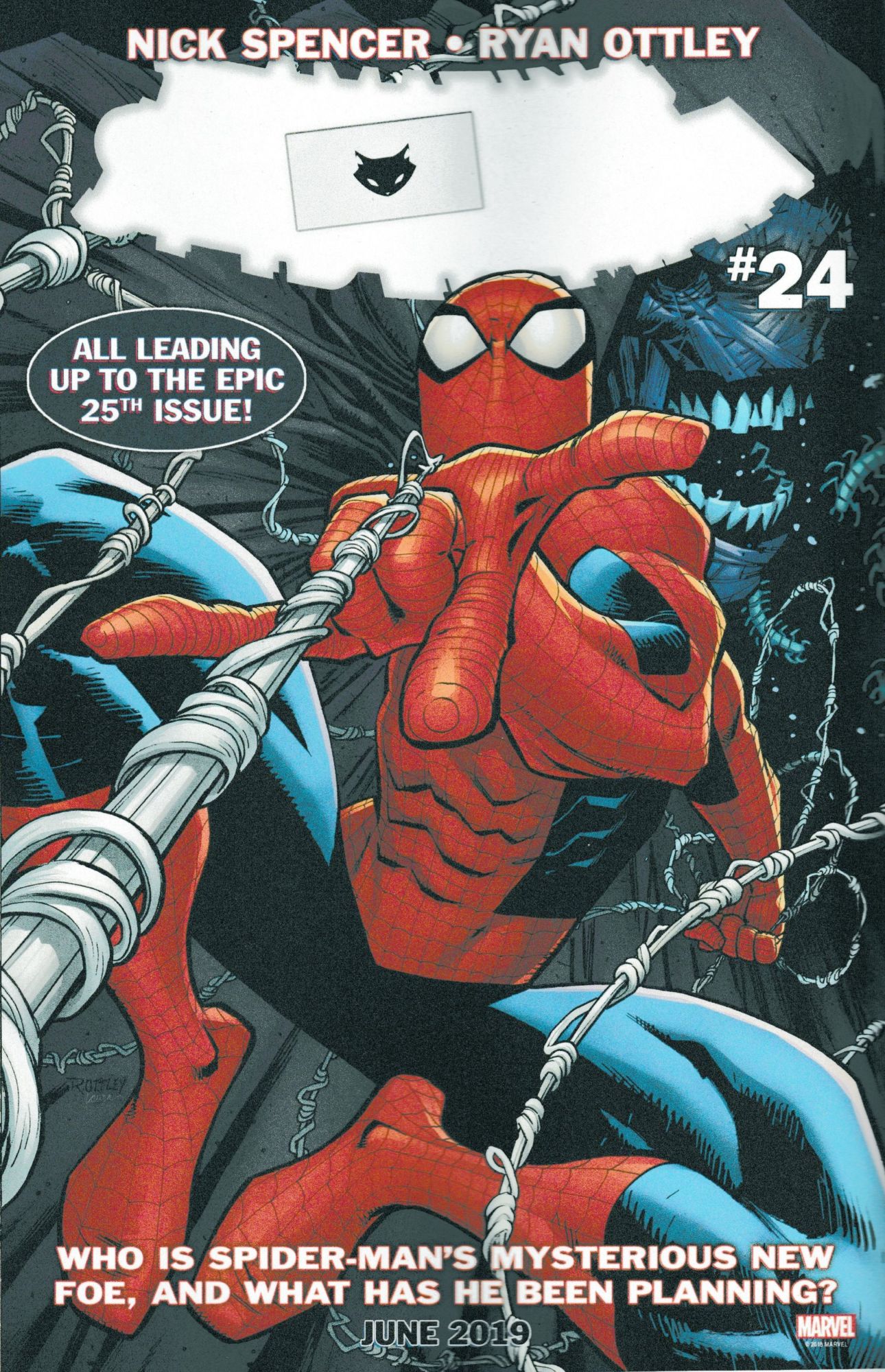 This is how Amazing Spider-Man #24 by Nick Spencer and Ryan Ottley was solicited, for June, with a 'mysterious' figure on the front cover with the text: