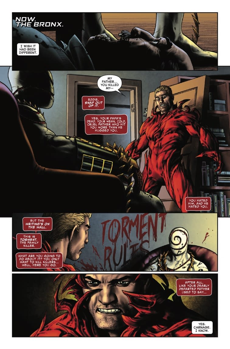 - Preview pages show Eddie's violent flashback with his abusive father before Carnage-fueled confrontation ensues