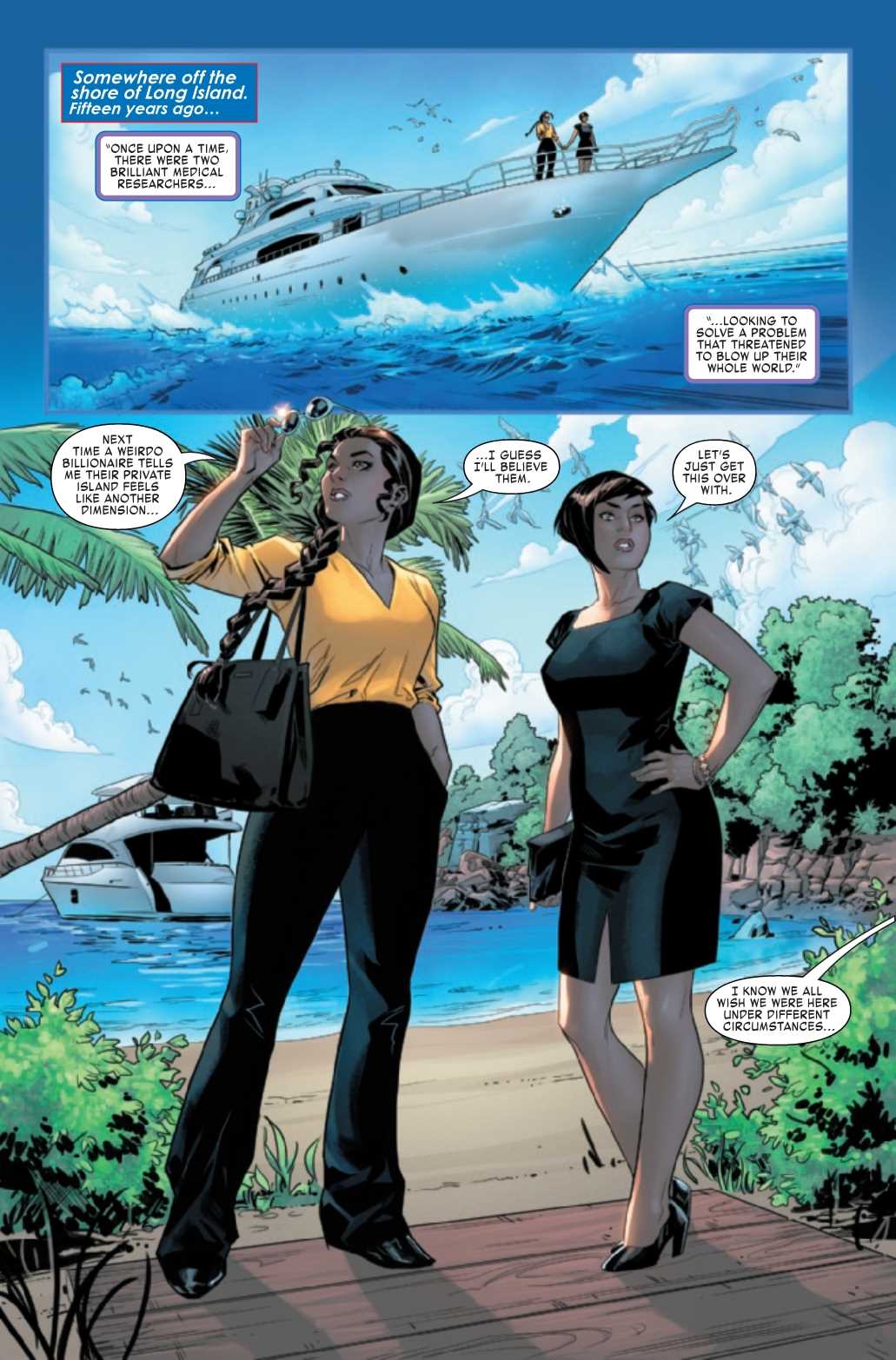 The solicit to America Chavez: Made in the USA #3 promises a shocking revelation. In fact, it promises a revelation "that will shake the foundations of everything she knows." What is Marvel's obsession with shaking the foundations of things, anyway? Come up with a new metaphor already. But anyway, they can't give away that revelation in this preview, so instead we get a flashback to when America's moms were still alive. Check it out below.