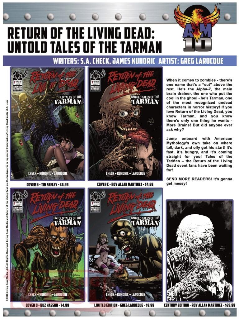 When it comes to zombies — there's one name that's a "cut" above the rest. He's the Alpha-Z, the main brain drainer, the one who put the cool in the ghoul — he's Tarman, one of the most recognized undead characters in horror history! If you love RETURN OF THE LIVING DEAD, you know Tarman, and you know there's only one thing he wants — more Brains! But did anyone ever ask why? Jump onboard with American Mythology's own take on where tall, dark, and oily got his start! It's fast, it's hungry, and it's coming straight for you! UNTOLD TALES OF THE TARMAN – the RETURN OF THE LIVING DEAD event fans have been waiting for! SEND MORE READERS! It's gonna get messy!
