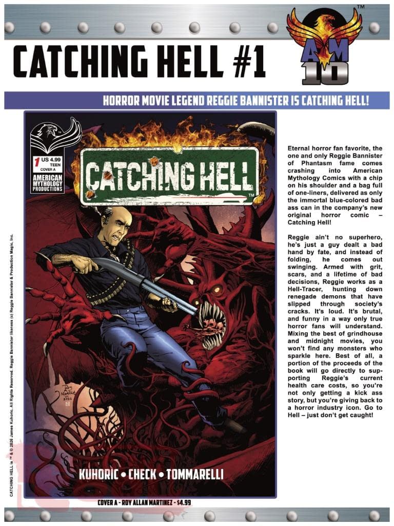 Eternal horror fan favorite, the one and only Reggie Bannister of PHANTASM fame comes crashing into American Mythology Comics with a chip on his shoulder and a bag full of one-liners, delivered as only the immortal blue-colored bad ass can in the company's new original horror comic– CATCHING HELL! Reggie ain't no superhero, he's just a guy dealt a bad hand by fate, and instead of folding, he comes out swinging. Armed with grit, scars, and a lifetime of bad decisions, Reggie works as a Hell-Tracer, hunting down renegade demons that have slipped through society's cracks. It's loud. It's brutal, and funny in a way only true horror fans will understand. Mixing the best of grindhouse and midnight movies, you won't find any monsters who sparkle here. Best of all, a portion of the proceeds of the book will go directly to supporting Reggie's current health care costs, so you're not only getting a kick ass story, but you're giving back to a horror industry icon. Go to Hell — just don't get caught!