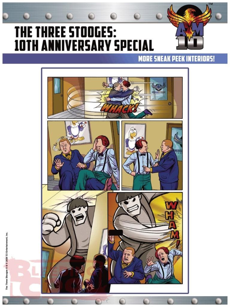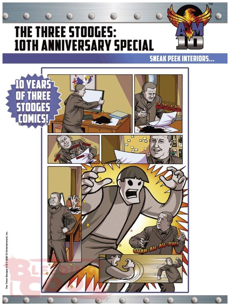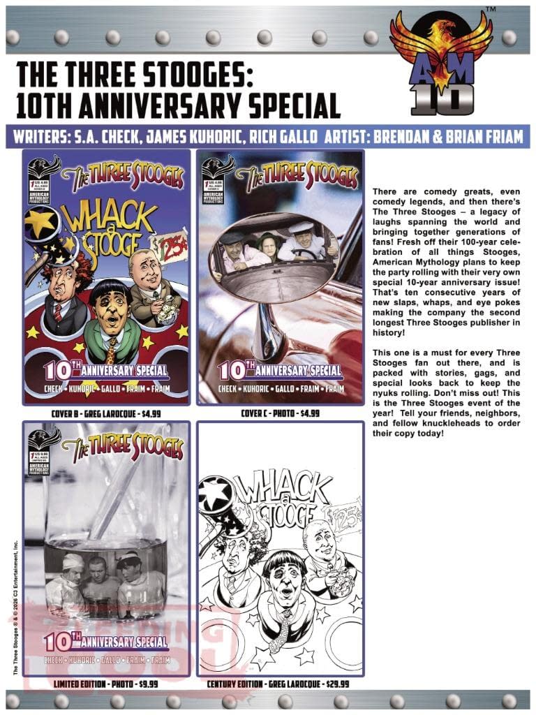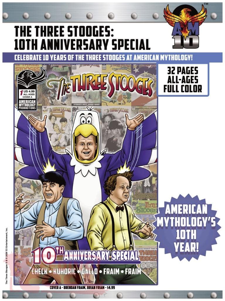 There are comedy greats, even comedy legends, and then there's The Three Stooges — a legacy of laughs spanning the world and bringing together generations of fans! Fresh off their 100-year celebration of all things Stooges, American Mythology plans to keep the party rolling with their very own special 10-year anniversary issue! That's ten consecutive years of new slaps, whaps, and eye pokes making the company the second longest Three Stooges publisher in history! This one is a must for every Three Stooges fan out there, and is packed with stories, gags, and special looks back to keep the nyuks rolling. Don't miss out! This is the Three Stooges event of the year! Tell your friends, neighbors, and fellow knuckleheads to order their copy today! $4.99 6/24/2026
