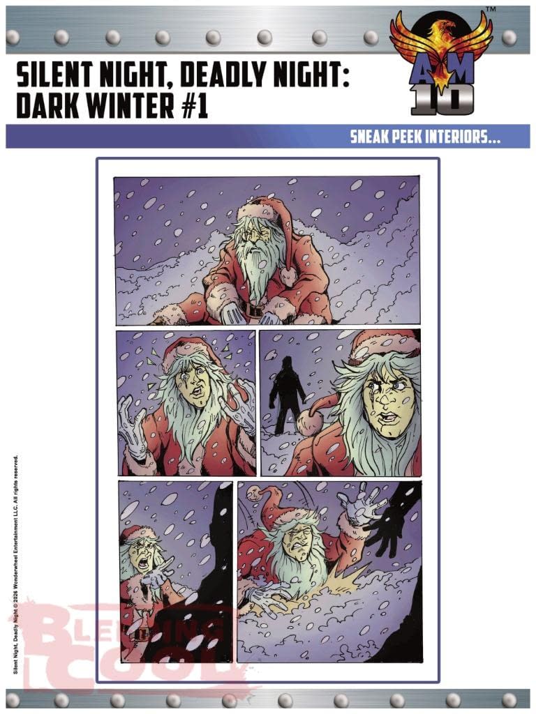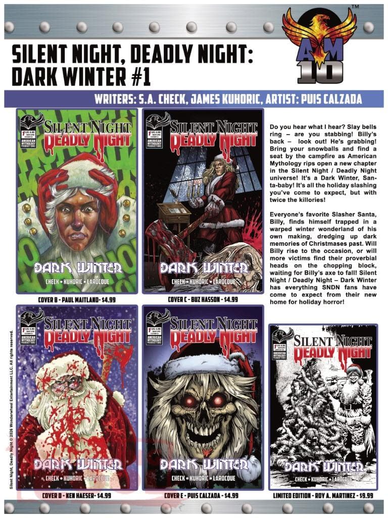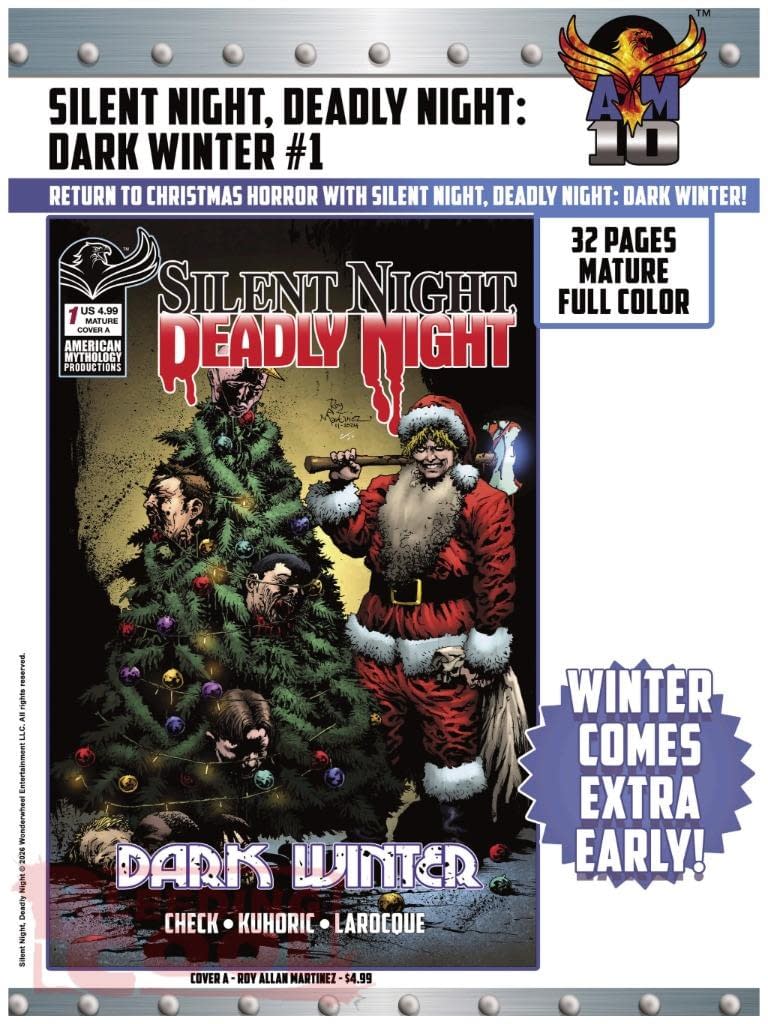 Do you hear what I hear? Slay bells ring — are you stabbing! Billy's back — look out! He's grabbing! Bring your snowballs and find a seat by the campfire as American Mythology rips open a new chapter in the SILENT NIGHT, DEADLY NIGHT universe! It's a Dark Winter, Santa-baby! It's all the holiday slashing you've come to expect, but with twice the killories! Everyone's favorite Slasher Santa, Billy, finds himself trapped in a warped winter wonderland of his own making, dredging up dark memories of Christmases past. Will Billy rise to the occasion, or will more victims find their proverbial heads on the chopping block, waiting for Billy's axe to fall! SILENT NIGHT, DEADLY NIGHT: DARK WINTER has everything SNDN fans have come to expect from their new home for holiday horror!