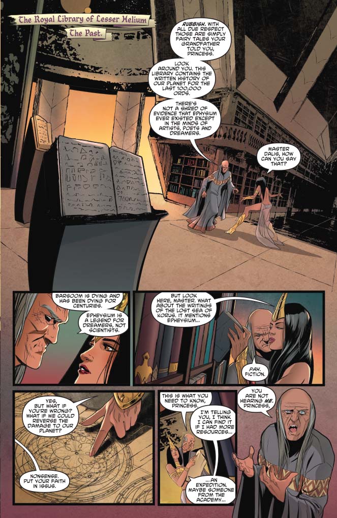 What better way to start off issue 1 but with a SPLASH! This is a bit of a holographic dream montage with Dejah Thoris and her grandfather walking through what ancient Barsoom looked like in more verdant times. Imagine a trip through a Martian Natural History Museum, if you will… oh, hey, here's a thought for the ERB folks — wouldn't a Barsoom World theme park be amazing? Chew on that, and moving right along…