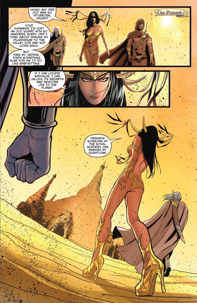 Can you tell I enjoy writing Dejah's curmudgeonly bodyguard, Sajad? I channeled just a little Larry Hama here, lol. For the character design, I asked Pasquale to think Rooster Cogburn and True Grit.