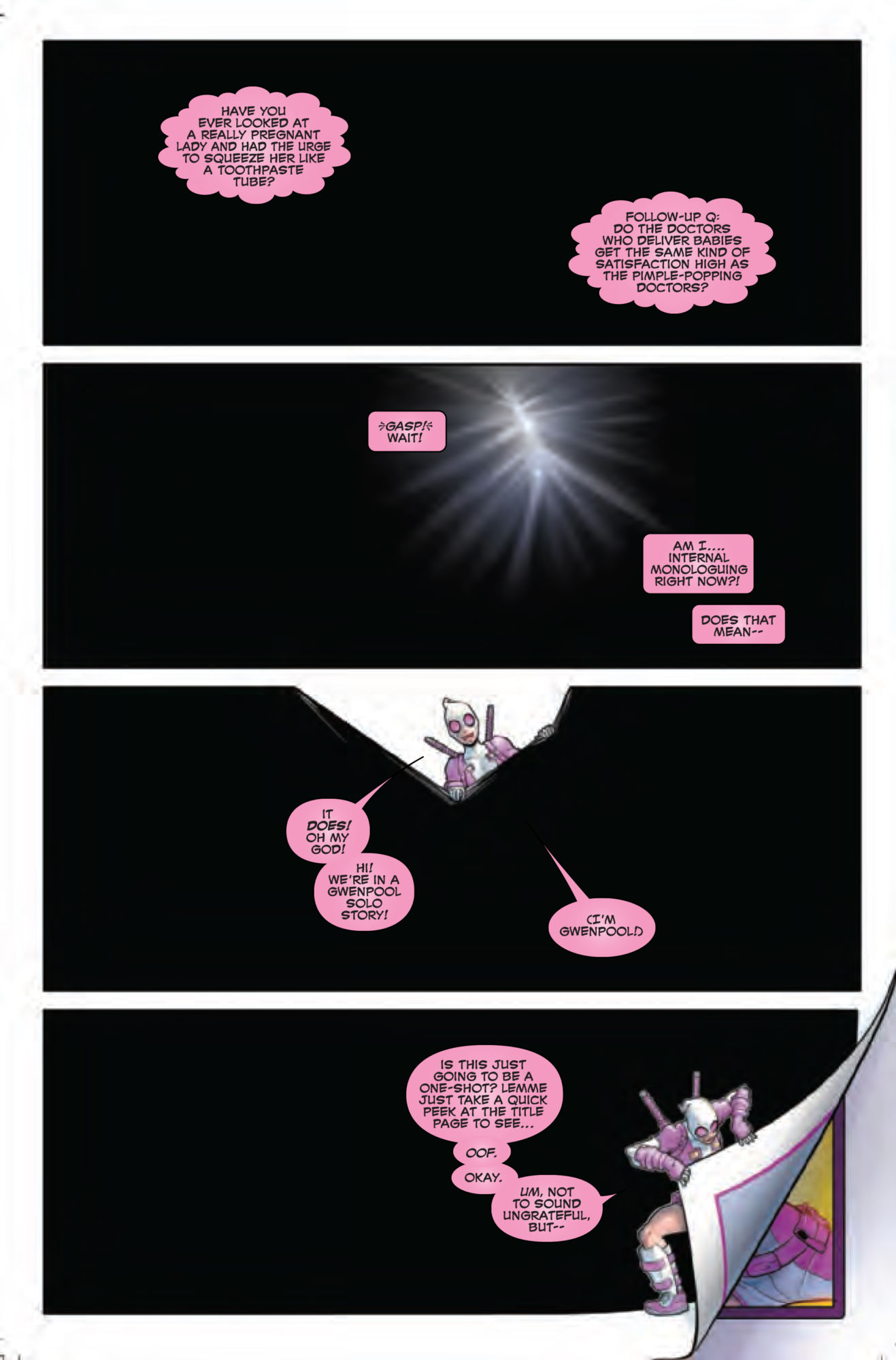 …with Gwenpool expressing the desire to squeeze pregnant women, and surprised to find herself in a solo series again.