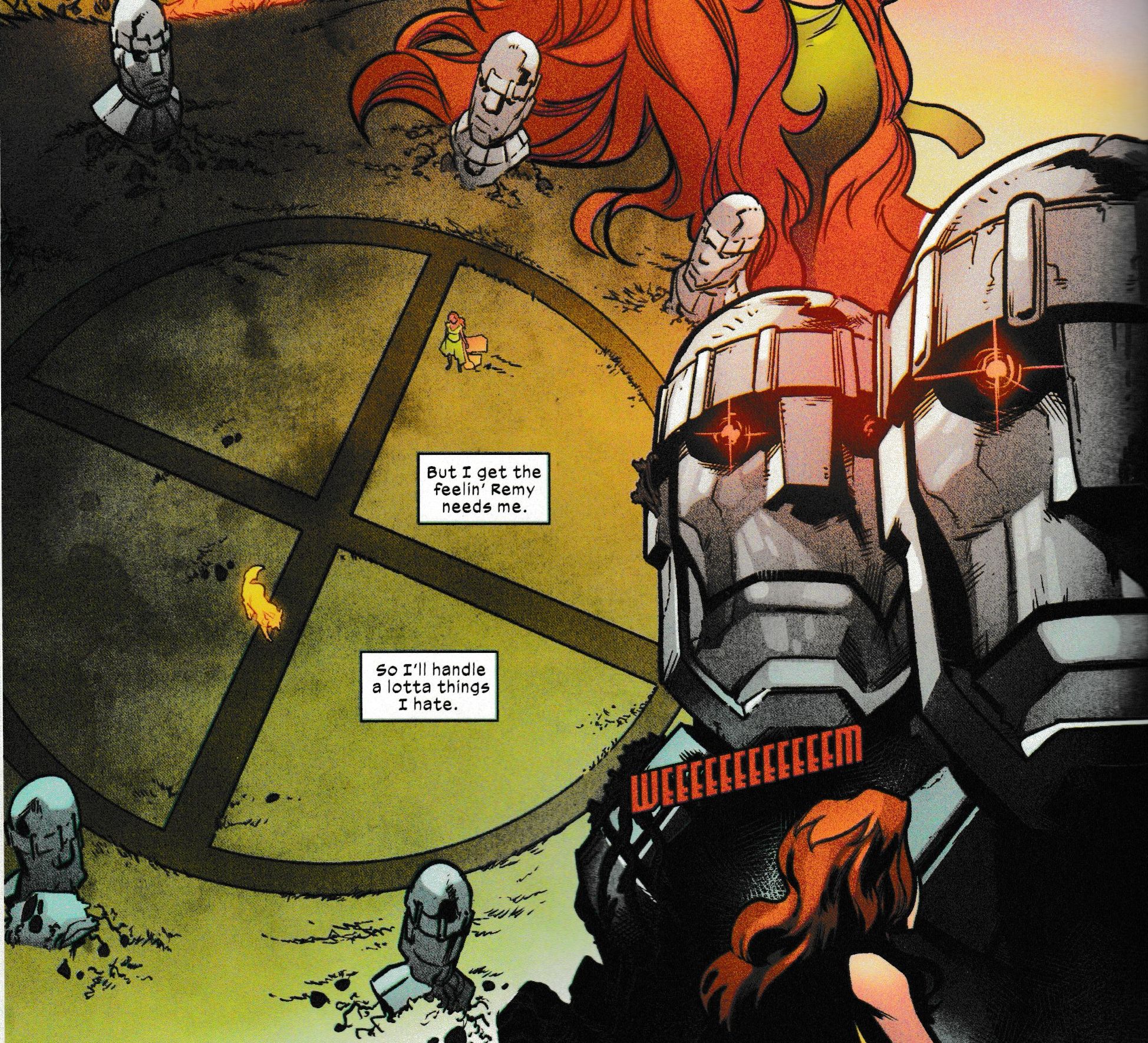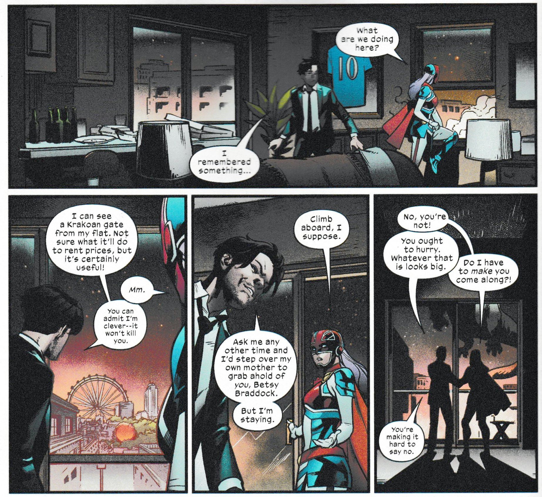 …and the view from the window of a Krakoan gate is in South London, if the view of the London Eye is anything to go by. Somewhere around the Newington estate maybe? And come on Wisdom, Betsy Braddock is all but offering herself and, courtesy of Fallen Angels…