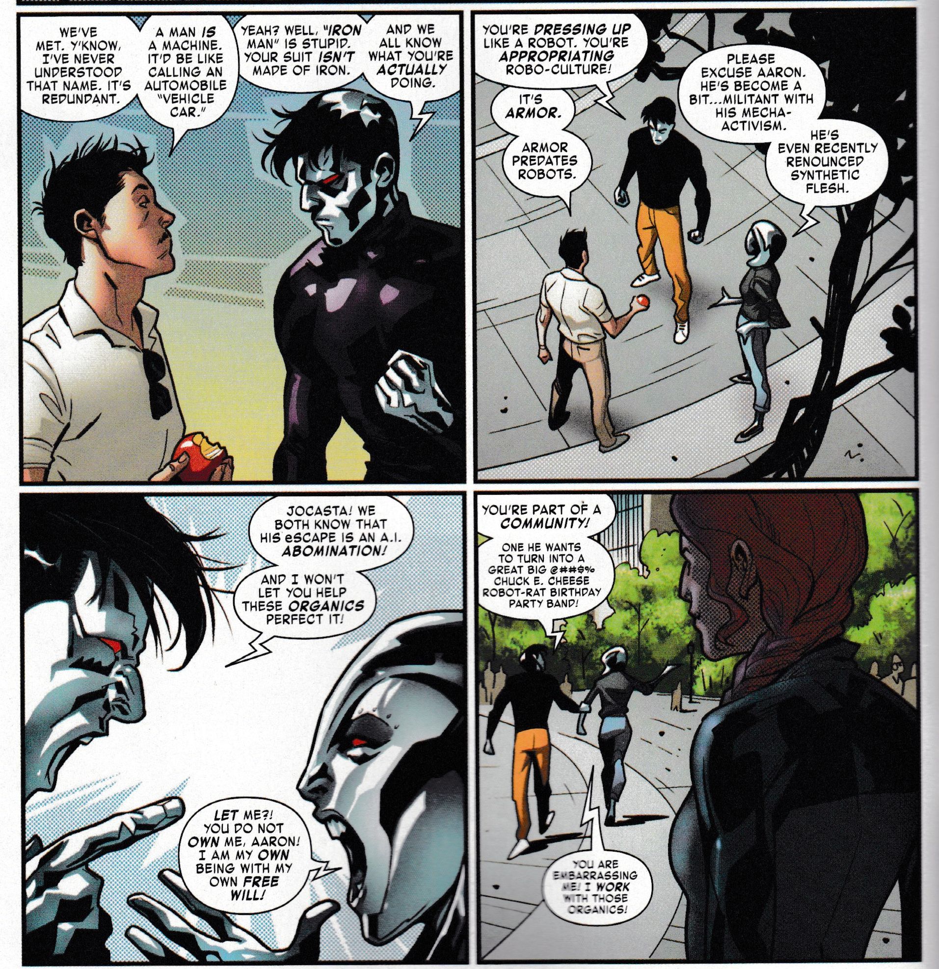 And we have Machine Man as Jocasta's partner, using the kind of language he picked up from Warren Ellis in the NextWave series — and turned into a robot rights activist. And while Jocasta fights from within the Stark Industries machine to preserve rights for robots, artificial intelligence, and sentient machines, Machine Man has a rather more militant view. And he attacks Iron Man for, well, cultural appropriation.