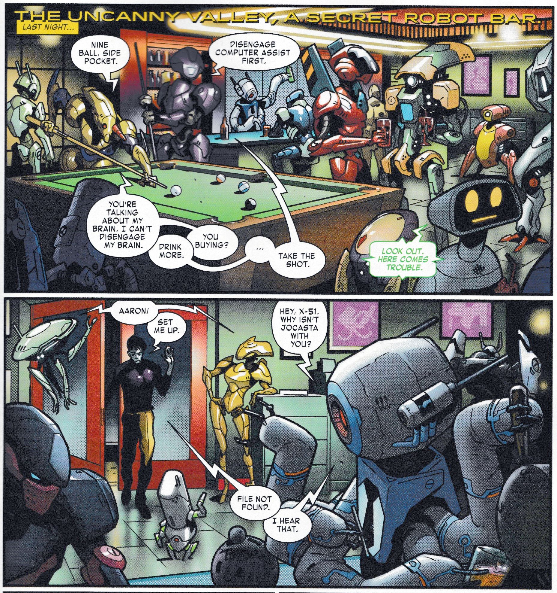 Part of a community? One that the comic is happy to show as well, in a new Marvel location, the Uncanny Valley Secret Robot Bar.