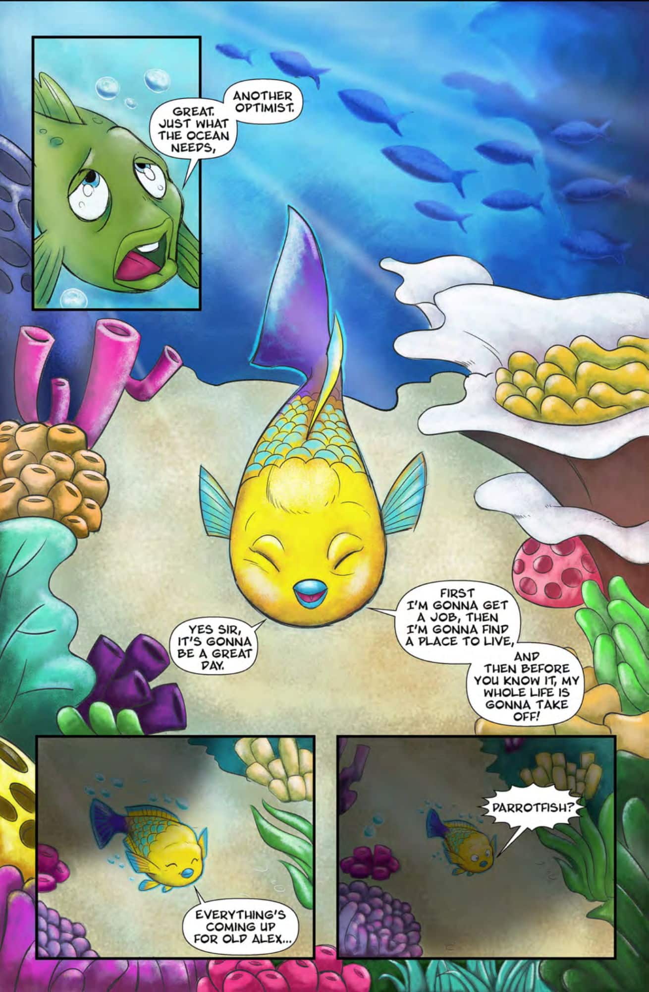 Alex the Parrotfish is off to the undersea city of New Corralton in search of fame and fortune (or at least a decent job). Before he's through, he'll face down hungry sharks, rude bureaucrat fish, and a shocking threat to the whole reef! How will Alex make it out in one piece? Find out in this all-new comic of GO FISH!